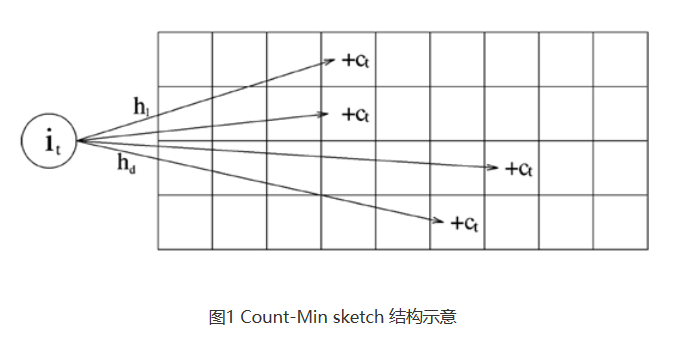 Count-Min sketch由多个哈希函数(f1...fn)和一张二维表组成。二维表的每个存储空间维护了一个计数器,其中每个哈希函数分别对应二维表中的每一行。