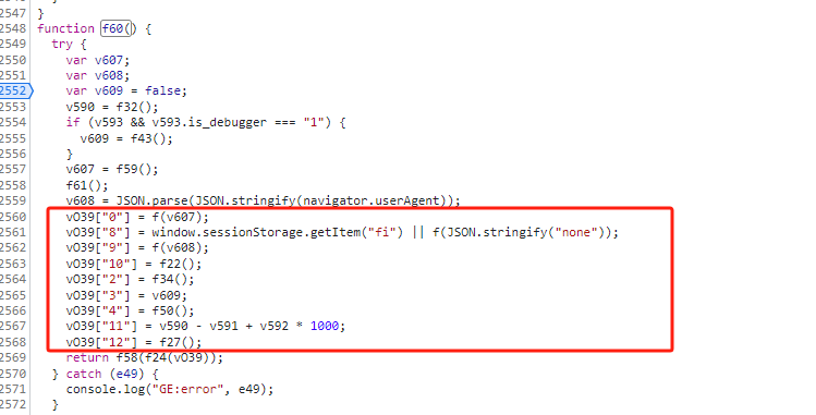 vO39大数组, 下标0 加密cokkie 下标2,自动化检测下标3 调试状态,下标4 默认false下标8 获取window的fi指纹下标9 加密nav的ua,下标10 浏览器类型下标11当前时间和sevevr的时间差值扩大1000倍下标12 随机截取五位数 然后进行AES加密。