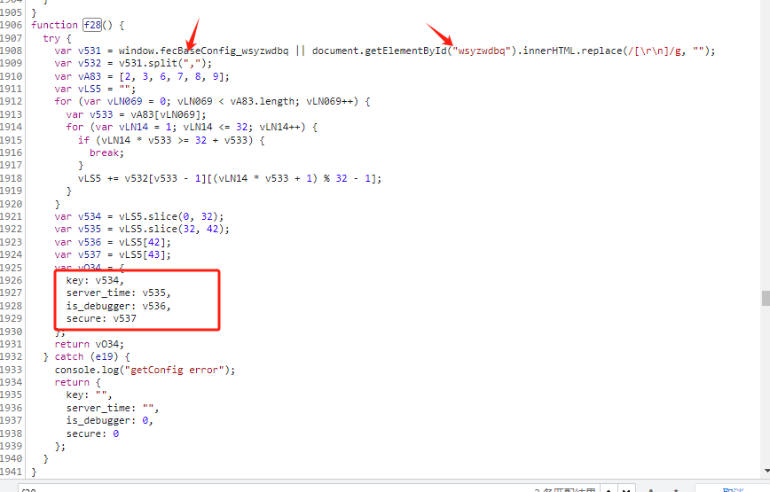 然后搜索v593的赋值,是f28方法生成的,这里读取了window的属性,或者读取dom属性,然后进行分割,封装