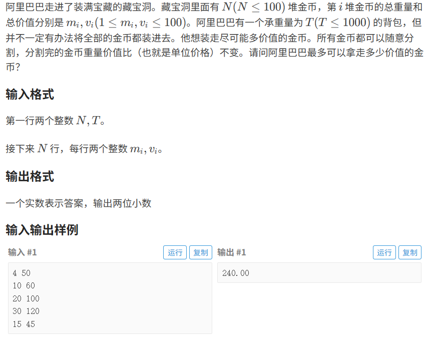 - 金币堆的重量>背包的重量 把背包剩余重量*这个金币堆的单价 然后退出