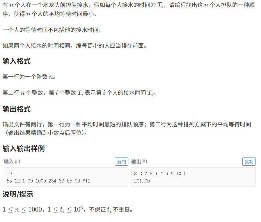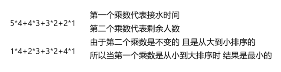 - 题目的意思是现在有 n个人在一个水龙头上接水 每个人的接水时间为 Ti