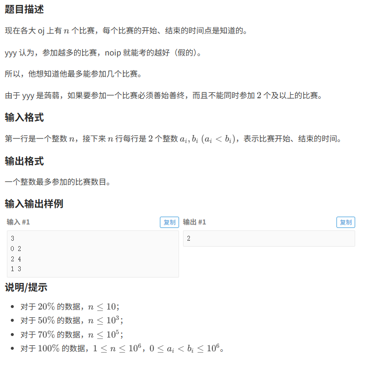 - 现在有n个比赛 分别给出开始的时间和结束的时间