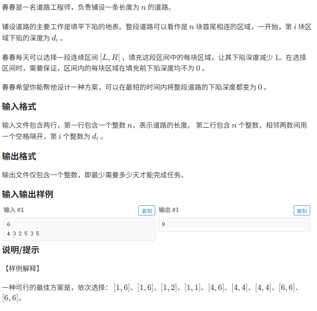 根据题目给出的样例解释:是每次选最长的区间进行处理直到全部坑的值为0结束