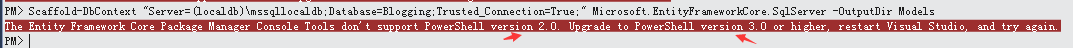 当我们在PowerShell运行以下命令从现有数据库创建模型时候,会提示如下错误: