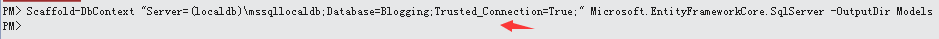 Scaffold-DbContext "Server=(localdb)\mssqllocaldb;Database=Blogging;Trusted_Connection=True;" Microsoft.EntityFrameworkCore.SqlServer -OutputDir Models