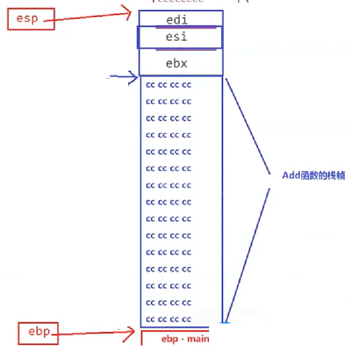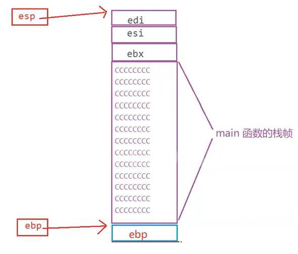 不难发现57*4=228正好等于为main函数开辟空间的大小,也就是说这个过程就是将main函数栈帧初始化为0XCCCCCCCC。