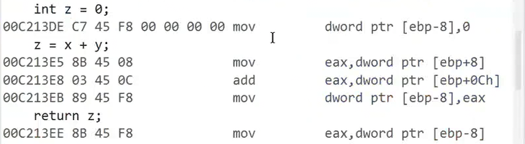 2.最后将ebp(ADD)-8(变量z)的值放到eax中,由于出函数之后函数栈帧销毁,所以要暂时存到寄存器中