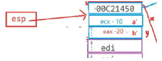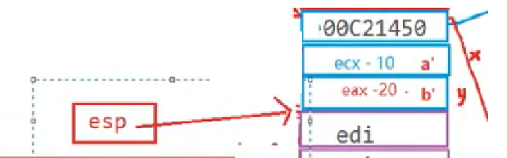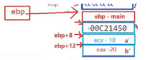 1.将ebp(main)-14h(b)的值放到eax中,也就是将局部变量b的值放进eax,并将eax压栈。此时形参b的地址就是ebp(main)-14h
