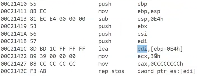 5.将ebp-0E4h(228)之后的地址放到edi中,将39h(57)放到ecx,0XCCCCCCCCh放到eax。