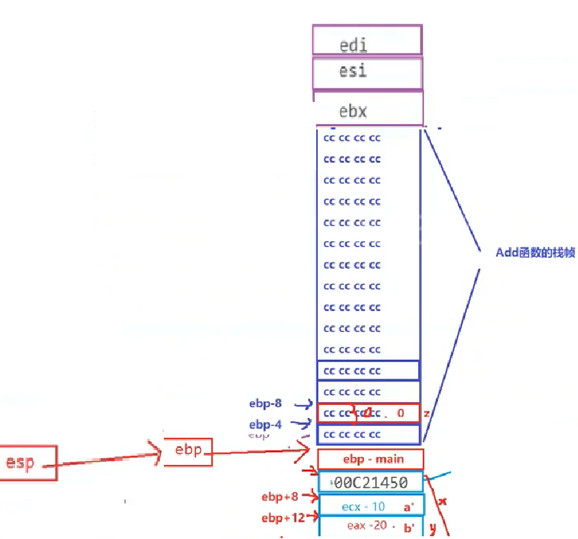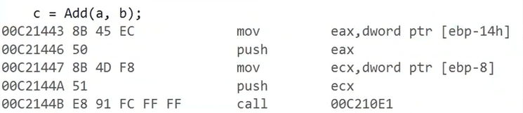 1.将ebp(ADD)+8(形参a)的值放到eax中,然后与ebp(ADD)+0Ch(形参b)的值相加。最后将eax中的加和放到ebp(ADD)-8(局部变量z)中