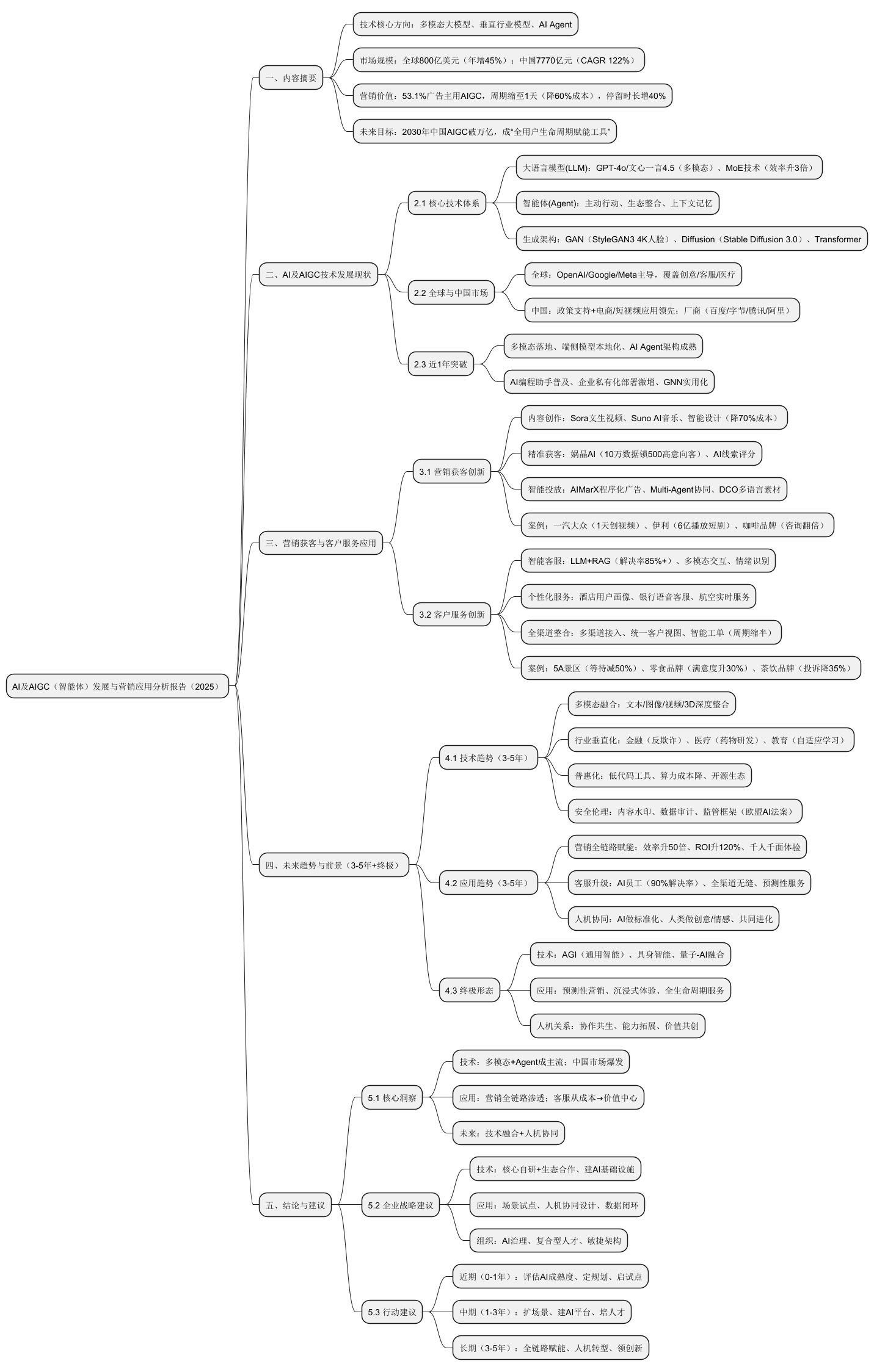 本报告全面分析 AI 及 AIGC(人工智能生成内容)技术发展现状、应用场景及未来趋势,重点聚焦营销获客与客户服务领域。当前,AI 工艺正从 "技术秀场" 转向 "企业落地" 阶段,多模态大模型(如 GPT-4o、文心一言 4.5)、垂直行业模型和智能体(Agent)成为技术发展的三大核心方向。从全球视角看,生成式 AI 市场规模已突破 800 亿美元,年增长率达 45%;中国市场更是呈现爆发式增长,2025 年市场规模预计达 7770 亿元,复合年均增长率高达 122%。在营销与客户服务领域,AI 技术已实现从内容创作到客户互动的全链路渗透。53.1% 的广告主已在创意内容中使用 AIGC 技能,接近 20% 的广告主在视频创作中超半数环节依赖 AI。AI 营销不仅能提升效率(制作周期从 6-8 天缩短至 1 天),还能降低成本(成本降低 60% 以上),同时提高用户参与度(用户停留时长增加 40%)。