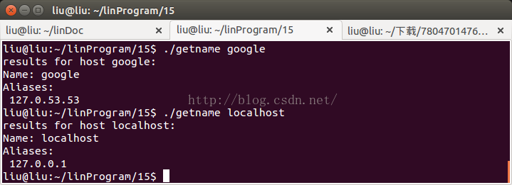 getname程序通过调用gethostbyname从主机数据库中提取出主机的信息。它打印出主机名、它的别名和该主机在它的网络接口上使用的IP地址。