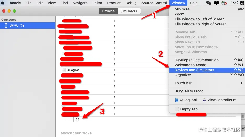 上边的红色箭头的1,2可以用于查看设备端通过 Xcode 安装的项目的日志;