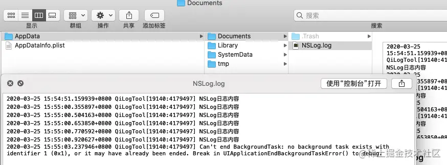 下图是笔者把 NSLog 的内容重定向输出到 NSLog.log 之后的截图。