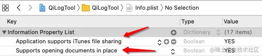 设置 Application supports iTunes file sharing 为YES。 设置 Supports opening documents in place 为 YES。