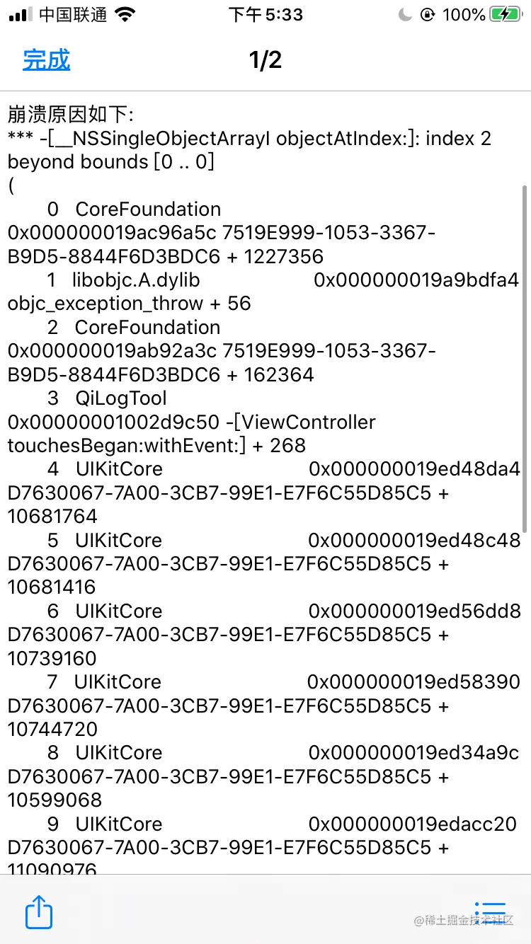 - (void)logTest { NSLog(@"NSLog日志内容"); // 测试日志工具 [QiLogTool logFile:@"logfile.log" content:[NSString stringWithFormat:@"时间:%@\n内容:%@\n", [[NSDate date] dateByAddingTimeInterval:8.0 * 60 * 60], @"logContent"]]; // 测试崩溃 记录日志效果 NSArray *arr = @[@(1)]; NSLog(@"arr[2]:%@", arr[2]); }