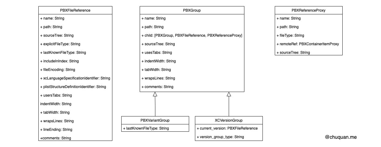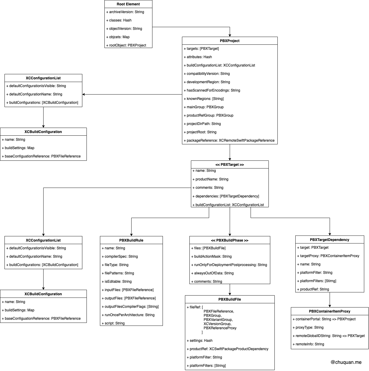 project.pbxproj 整体构成了一个树状的对象关系图,其类图大体如下所示。Xcode 中的各种概念大多数在类图中能够找到对应的类,比如:
