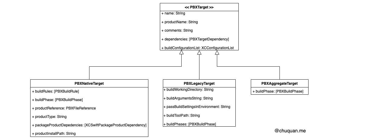 类图中定义的 PBXTarget 是一个抽象类,其主要有以下几种具体类型: