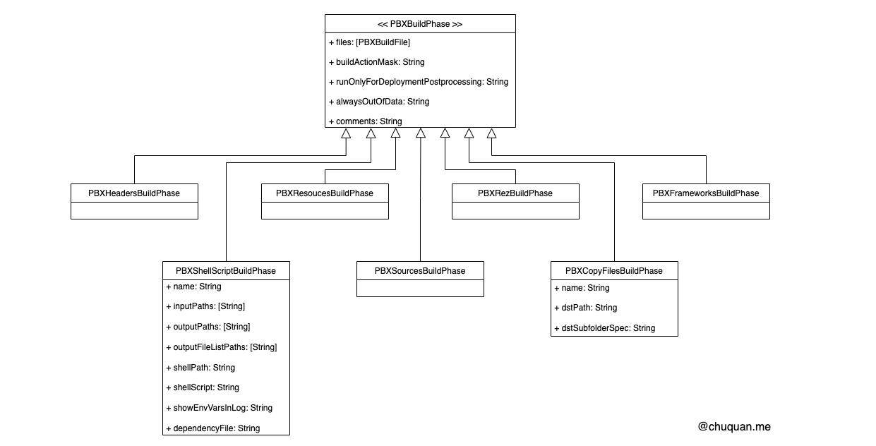 PBXBuildPhase 也是一个抽象类,其主要包含 7 种具体类型,正好与 Xcode 中的 7 种 build phase 相对应: