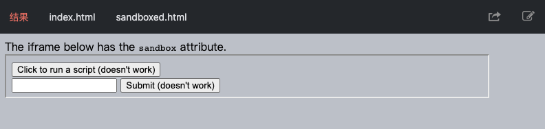 下面的示例演示了一个具有默认限制集的沙盒 iframe:<iframe sandbox src="...">。它有一些 JavaScript 代码和一个表单。