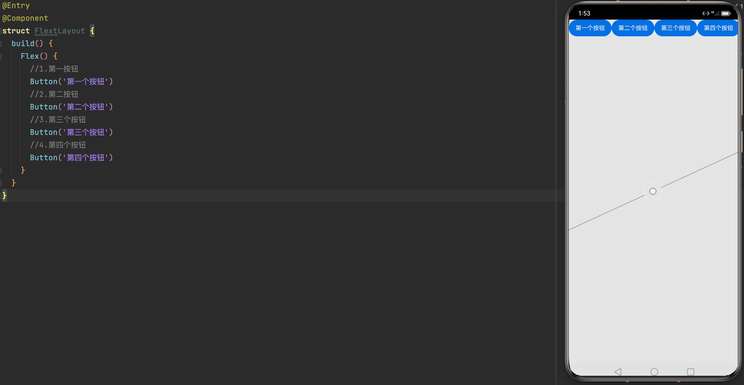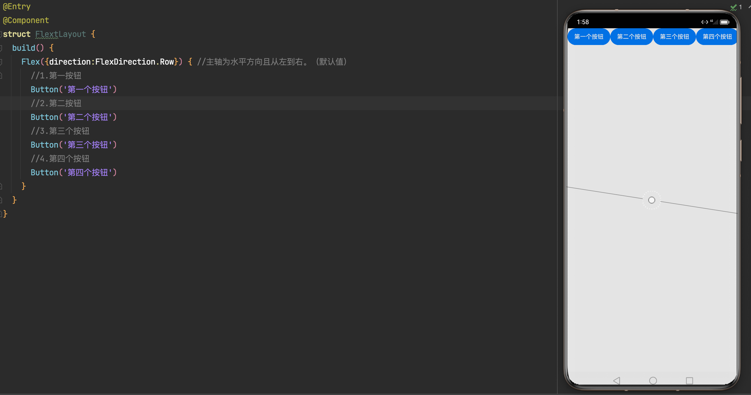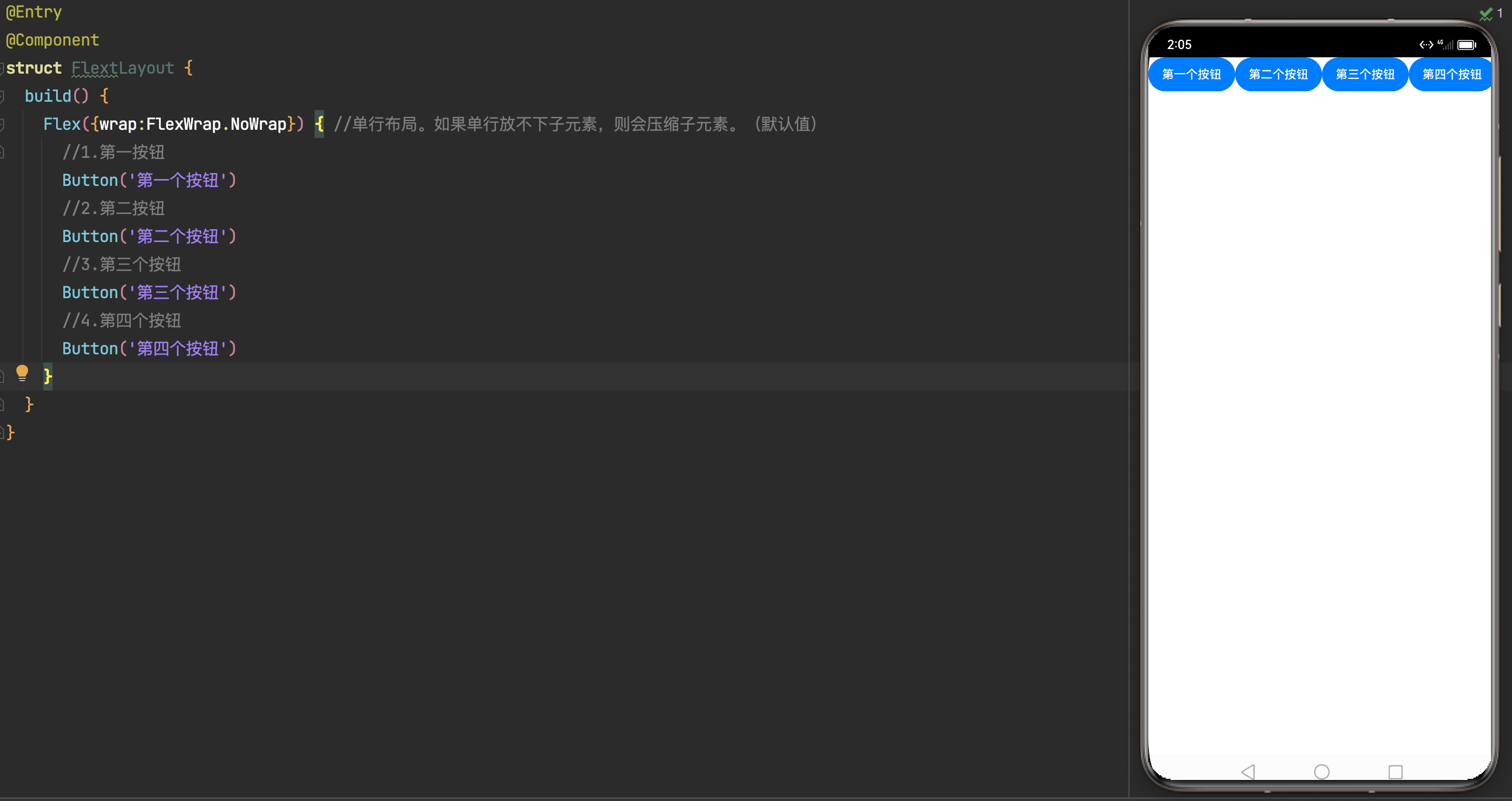 ❗️由于Flex容器组件默认是单行的,一行是放不了4个按钮的,所以按钮被压缩放到了一行。