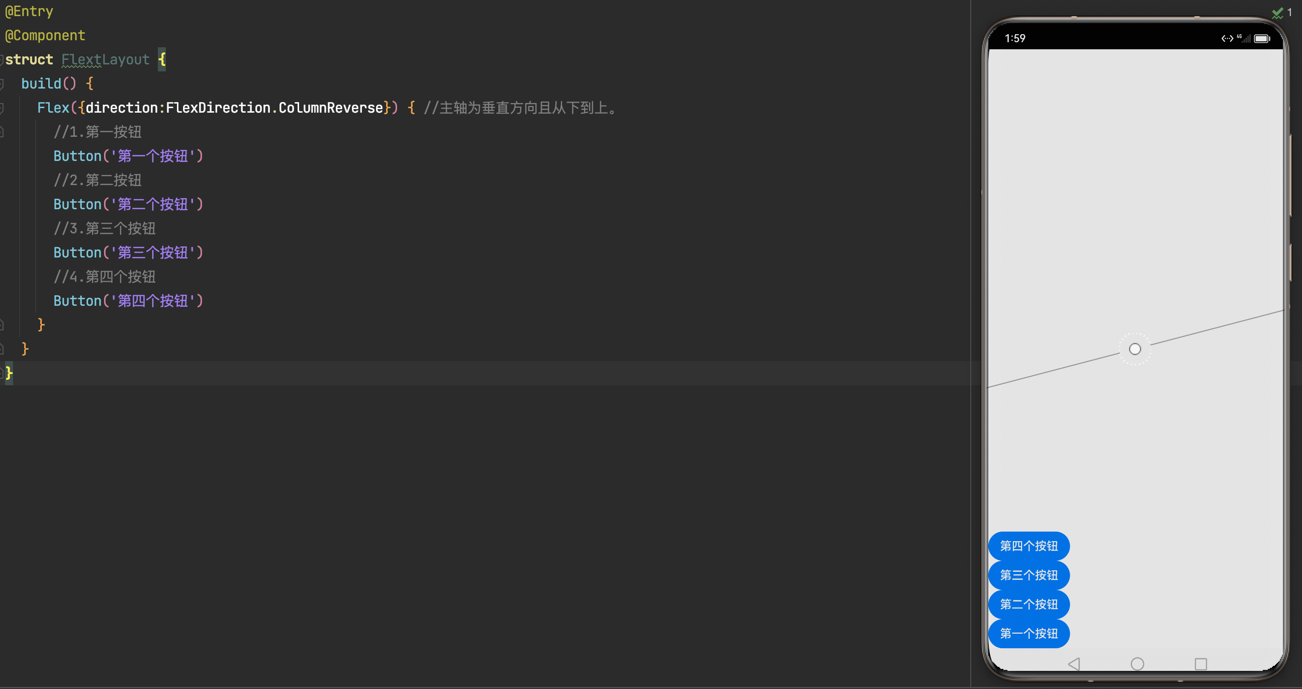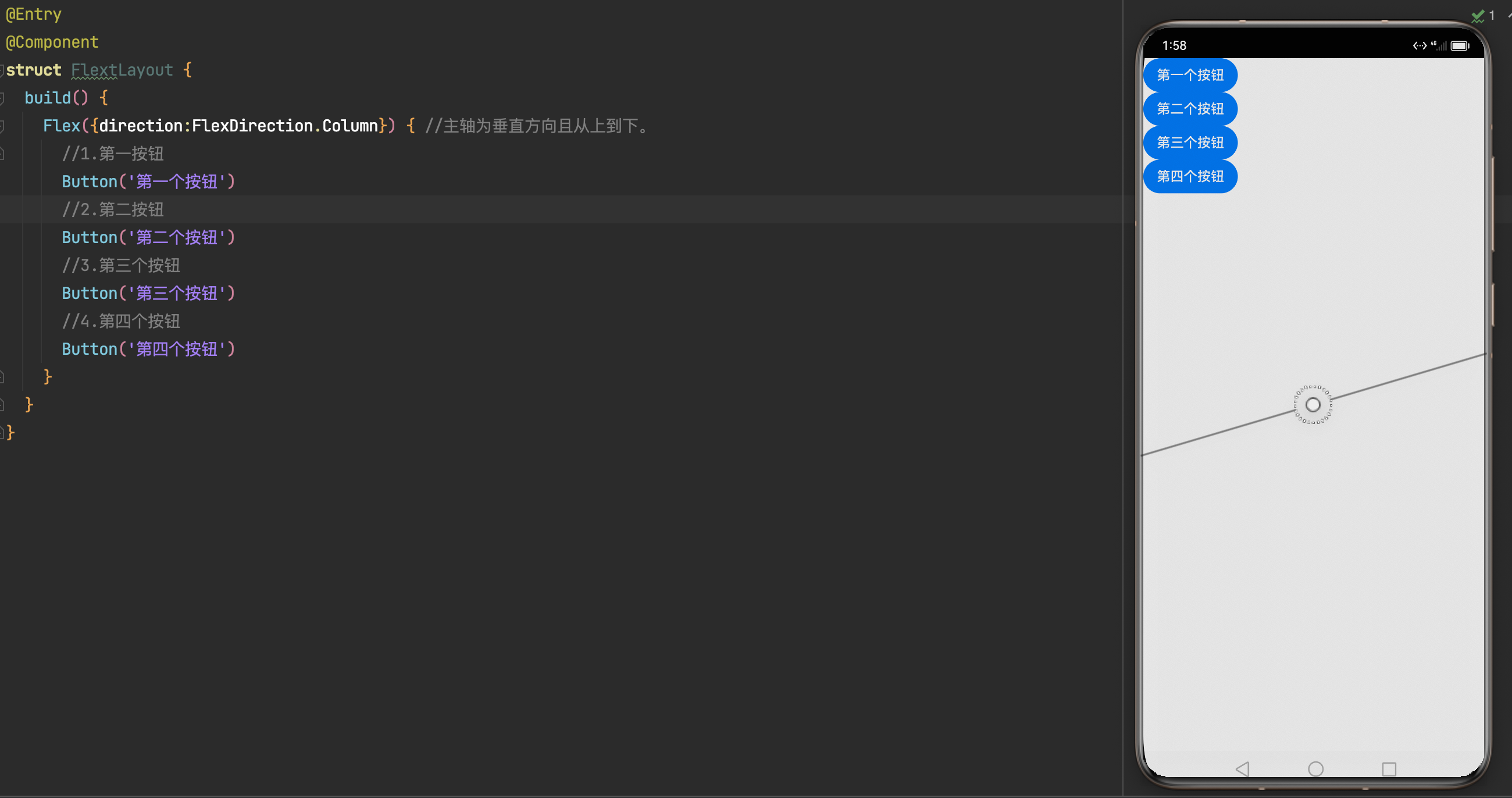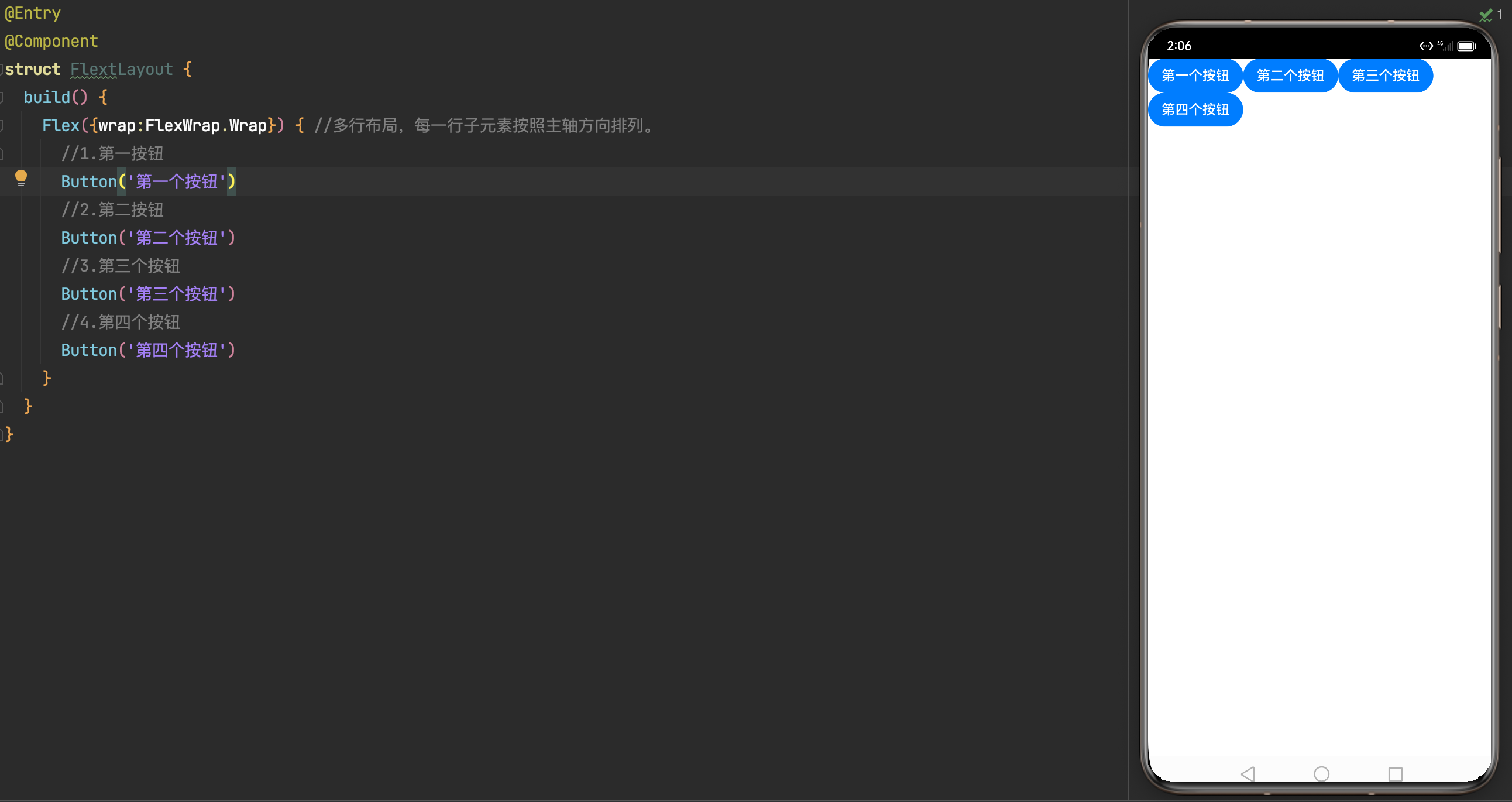 ❗️由于Flex容器组件默认是单行的,一行是放不了4个按钮的,所以按钮被压缩放到了一行。