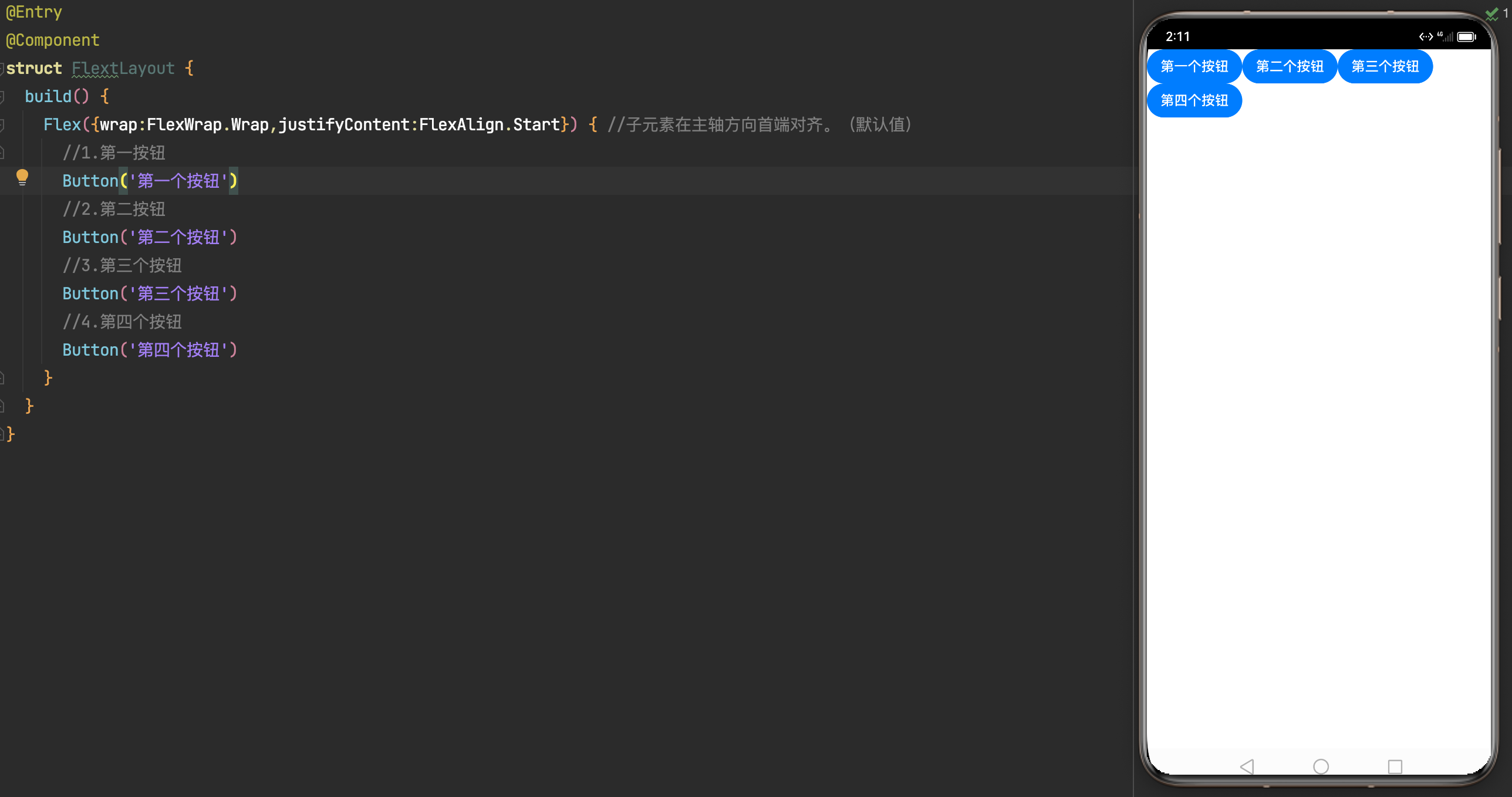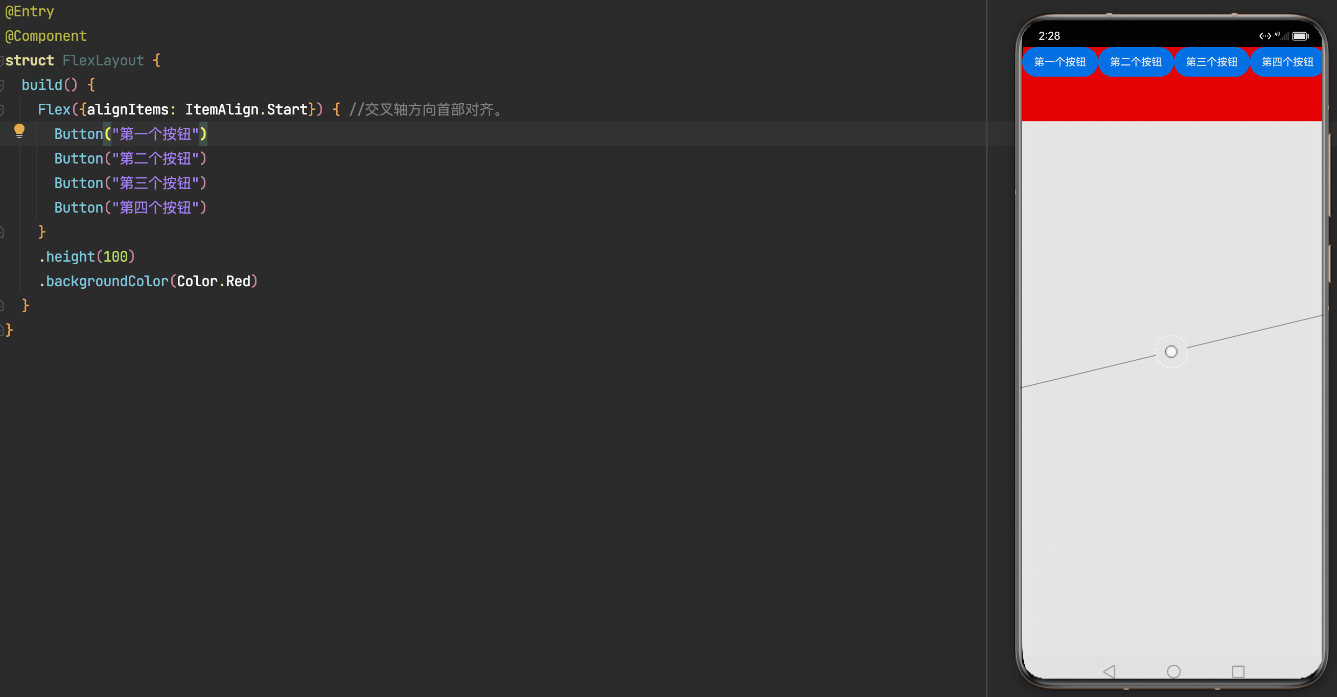 FlexAlign.Start:子元素各行与交叉轴起点对齐。