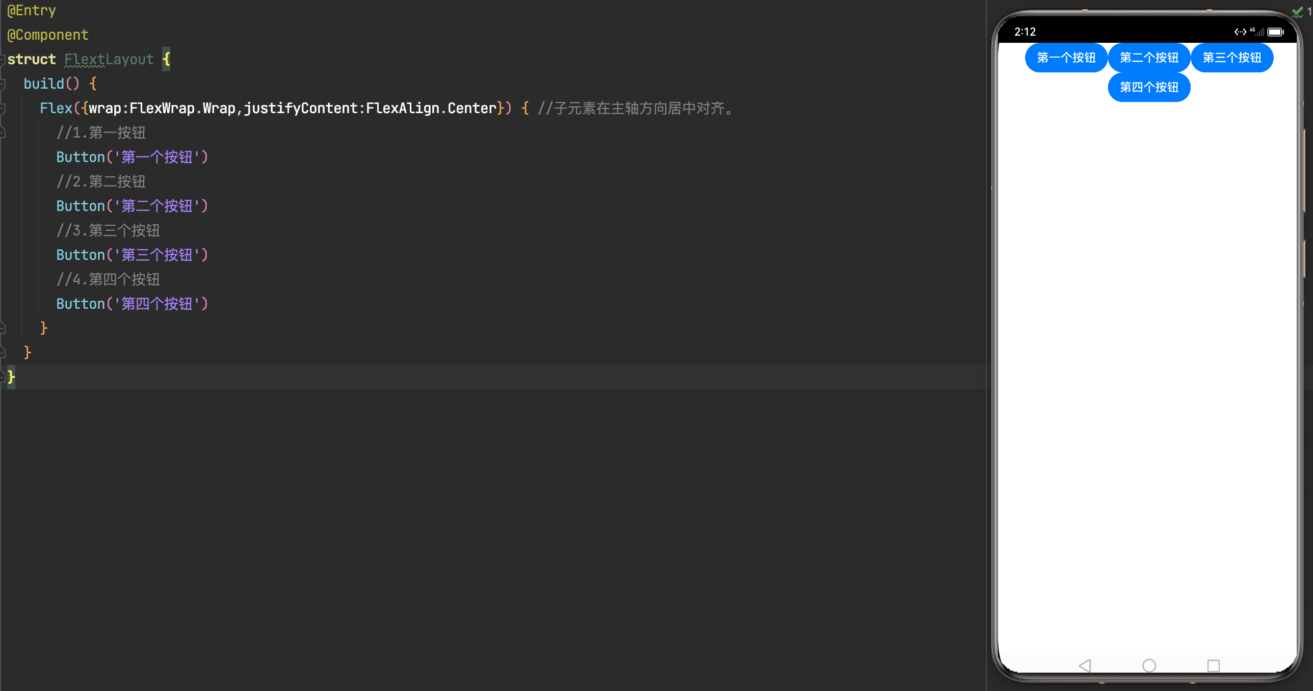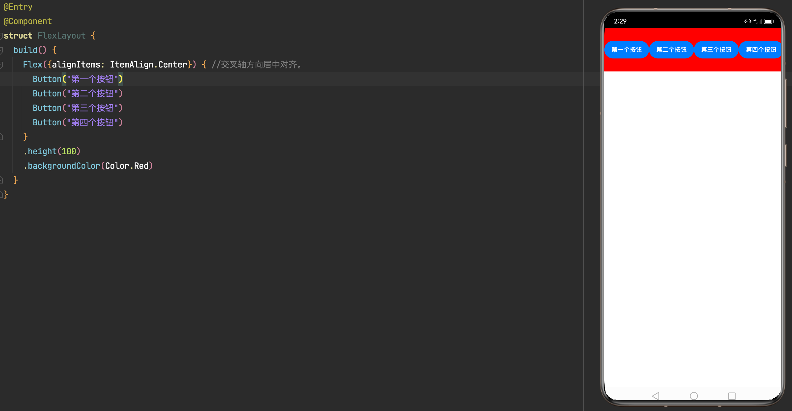 FlexAlign.Center:子元素各行在交叉轴方向居中对齐。