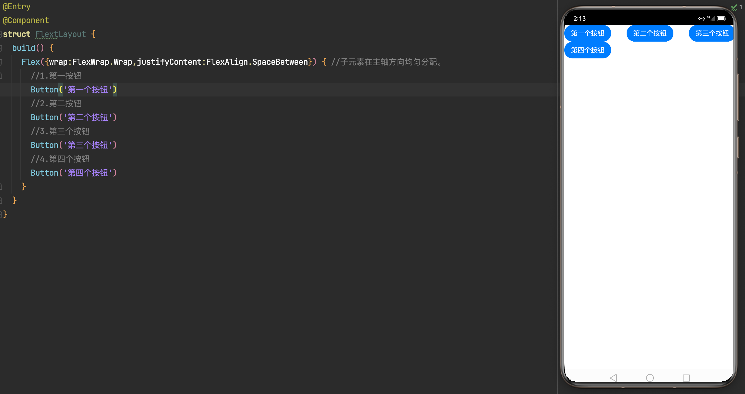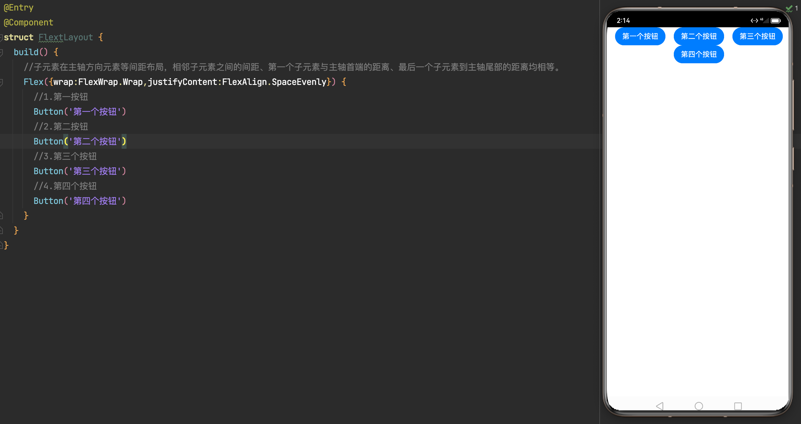 FlexAlign.SpaceEvenly: 子元素各行间距、子元素首尾行与交叉轴两端距离都相等。