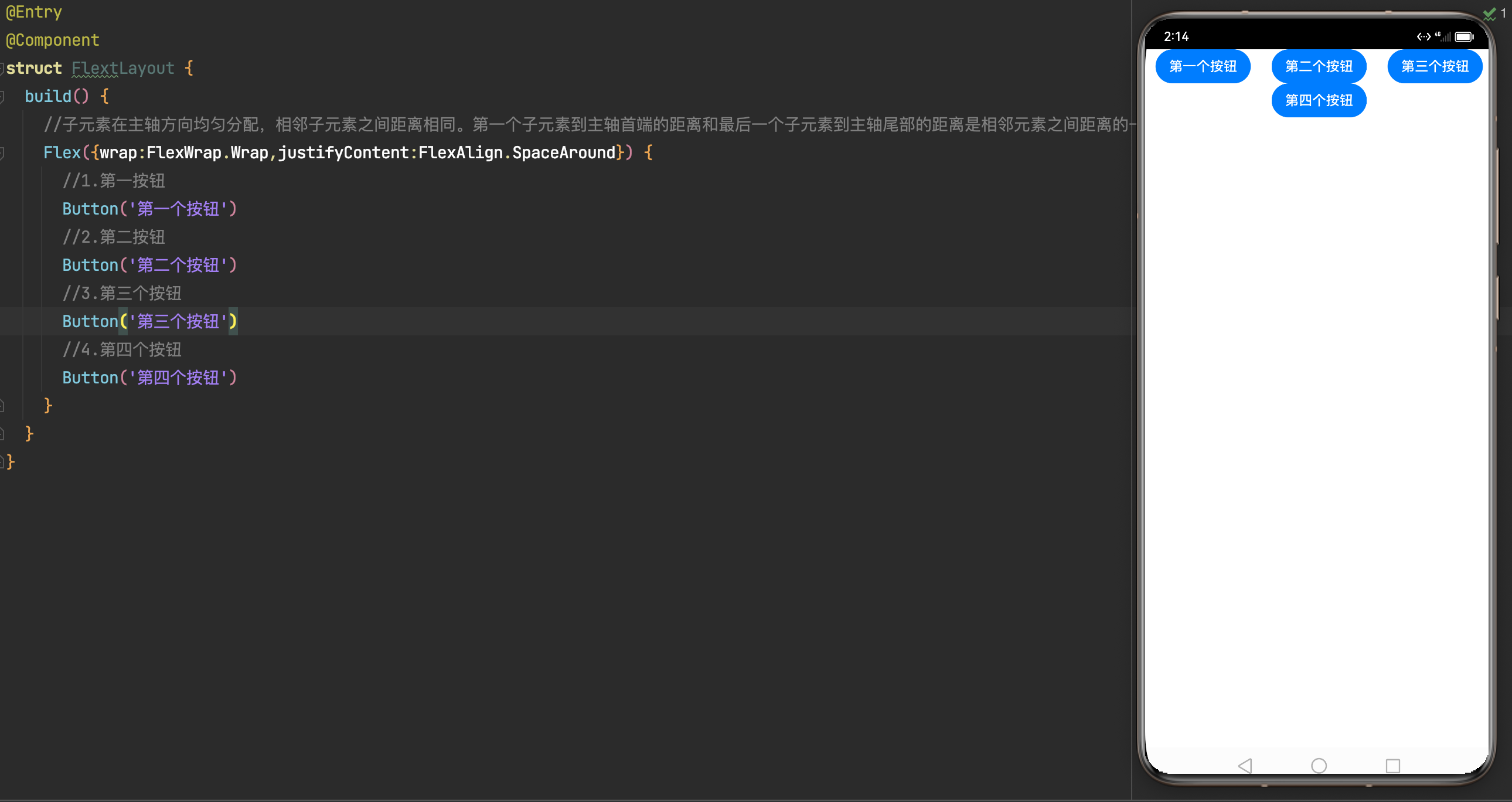 FlexAlign.SpaceAround:子元素各行间距相等,是元素首尾行与交叉轴两端距离的两倍。