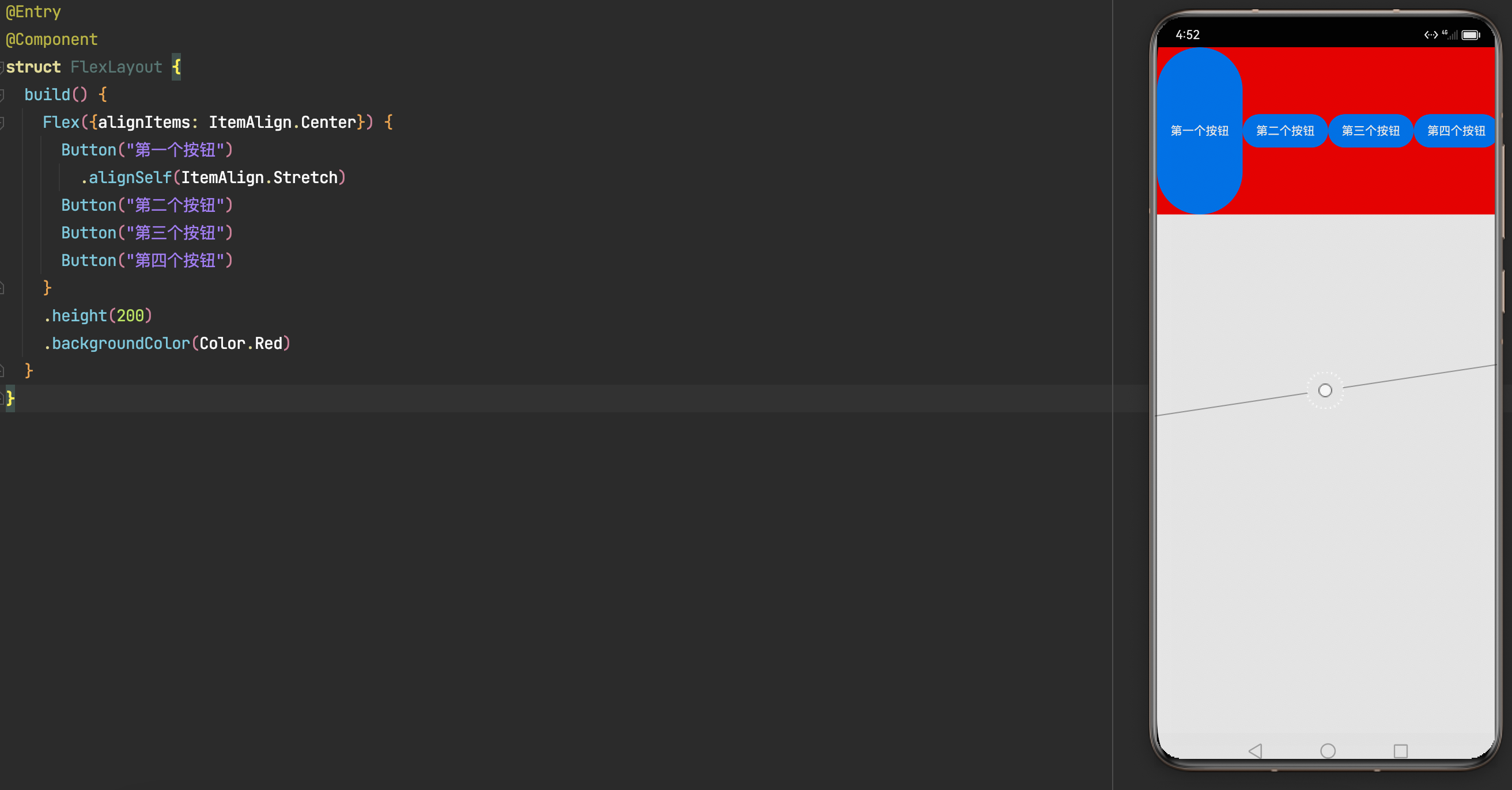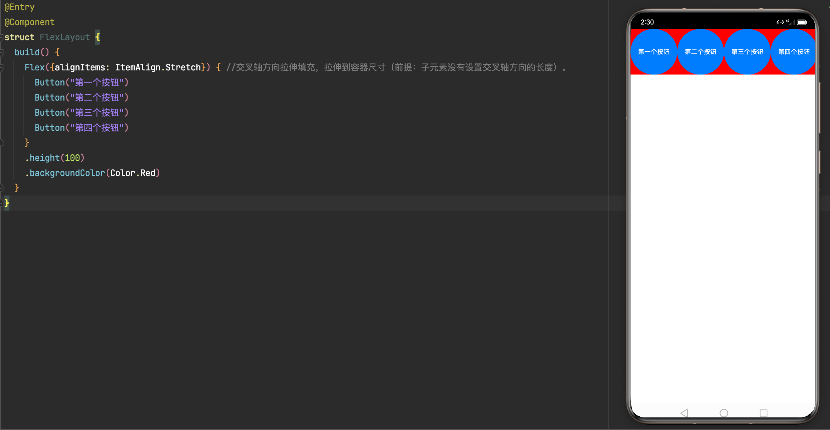 ItemAlign.Stretch 交叉轴方向拉伸填充,拉伸到容器尺寸(前提:子元素没有设置交叉轴方向的长度)。