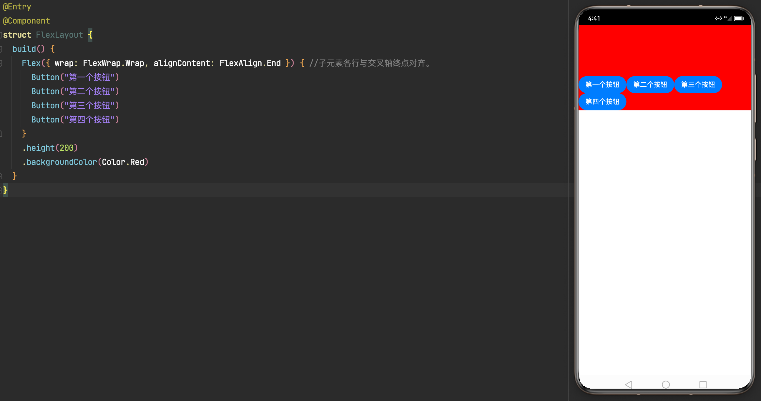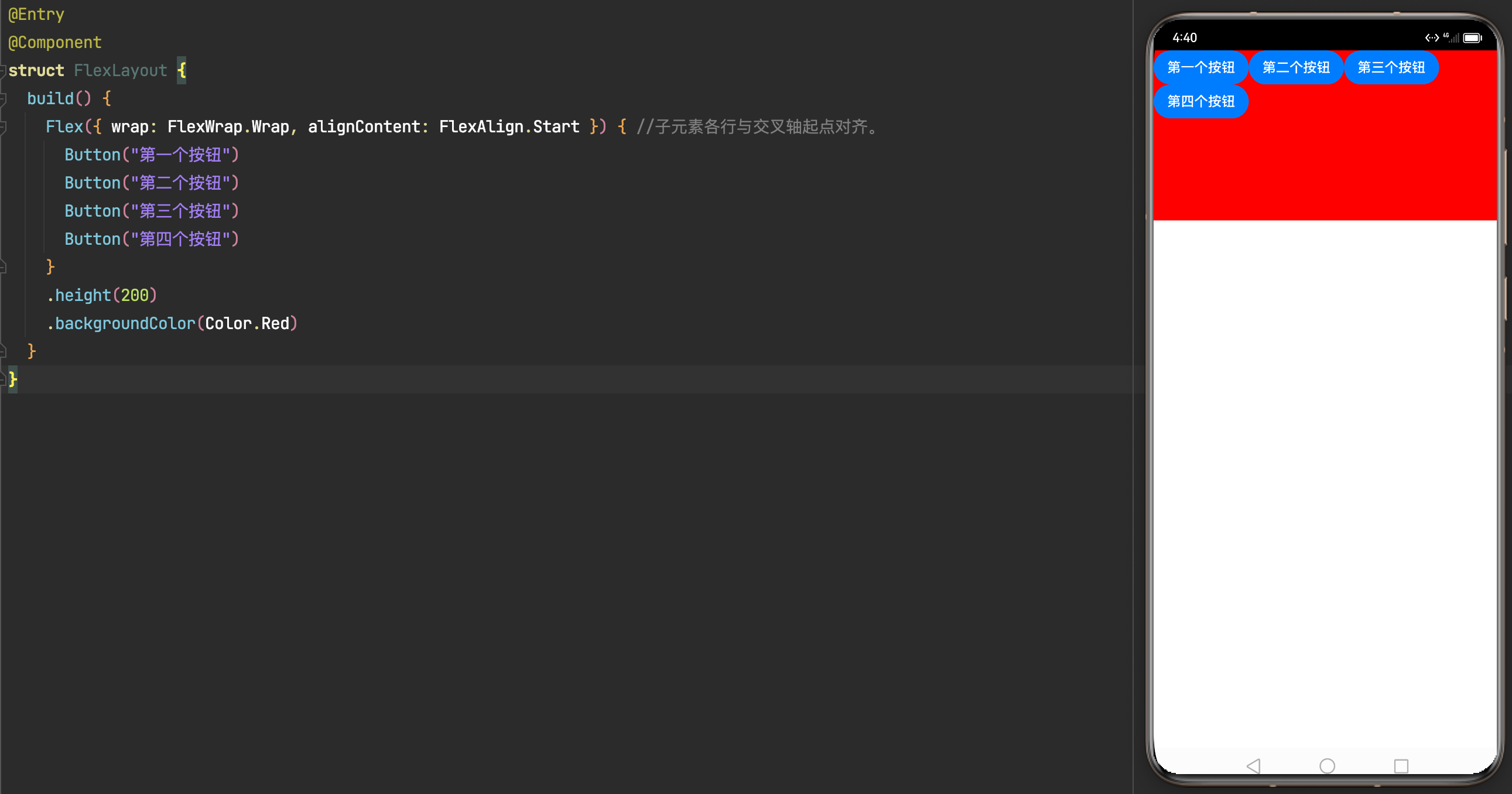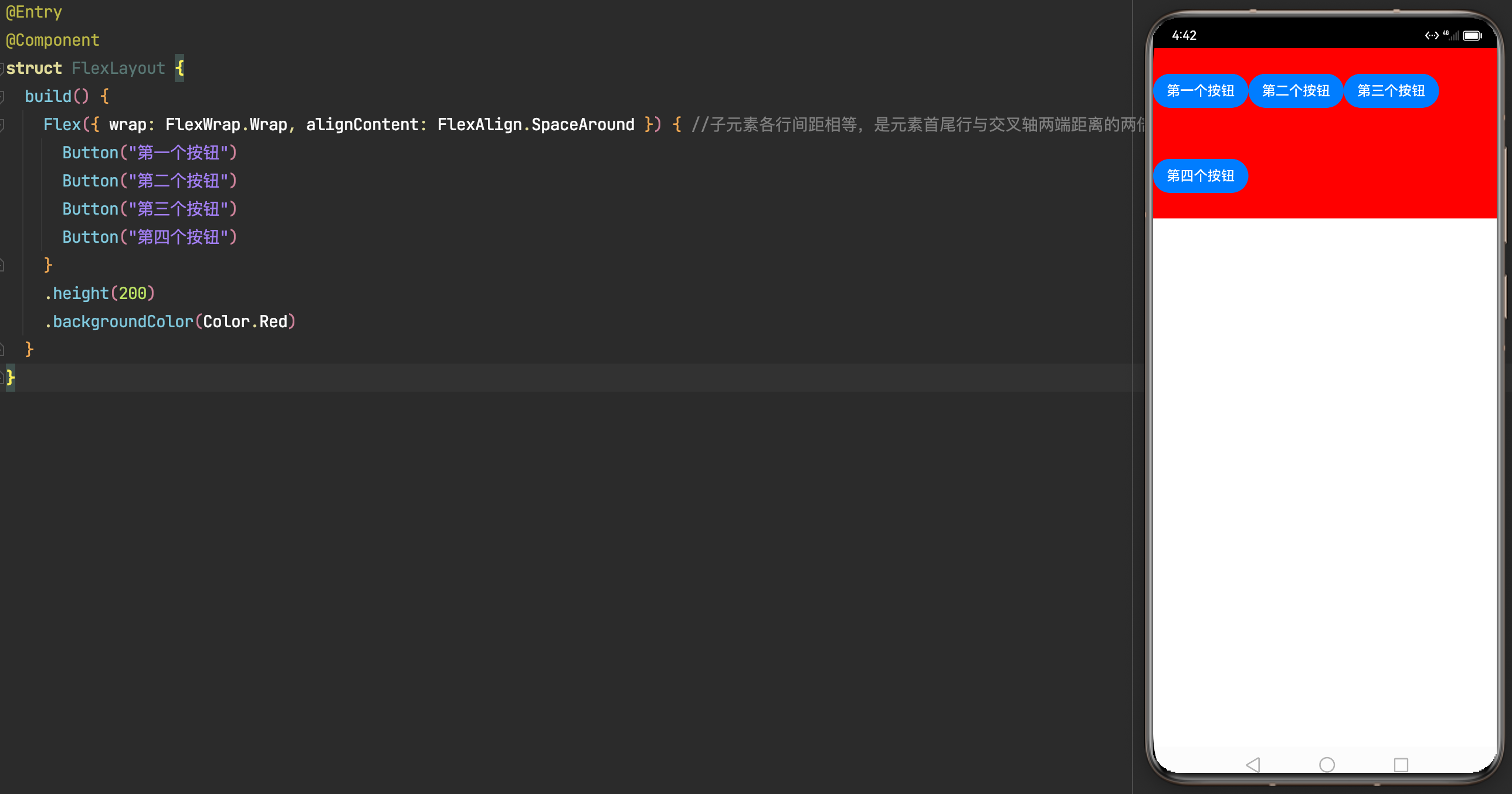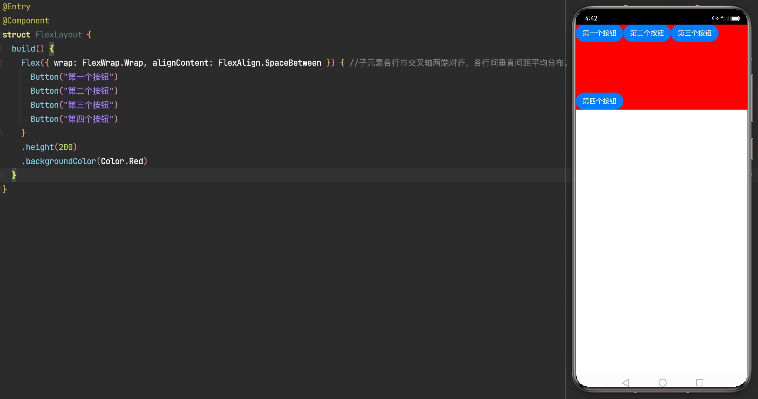 Flex容器组件通过 alignContent 参数设置子元素各行在交叉轴剩余空间内的对齐方式,只在多行的 Flex 布局中生效。