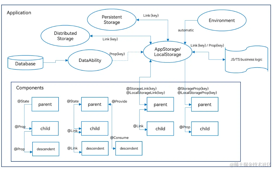 和AppStorage不同的是,LocalStorage是页面级的,通常应用于页面内的数据共享。而AppStorage是应用级的全局状态共享,还相当于整个应用的“中枢”,持久化数据PersistentStorage和环境变量Environment都是通过AppStorage中转,才可以和UI交互。
