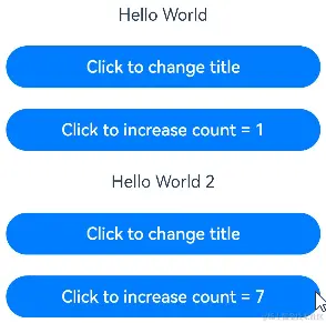 @Component struct MyComponent { @State title: Model = new Model('Hello World'); @State count: number = 0; private increaseBy: number = 1; build() { Column() { Text(`${this.title.value}`) .margin(10) Button(`Click to change title`) .onClick(() => { // @State变量的更新将触发上面的Text组件内容更新 this.title.value = this.title.value === 'Hello ArkUI' ? 'Hello World' : 'Hello ArkUI'; }) .width(300) .margin(10) Button(`Click to increase count = ${this.count}`) .onClick(() => { // @State变量的更新将触发该Button组件的内容更新 this.count += this.increaseBy; }) .width(300) .margin(10) } } }