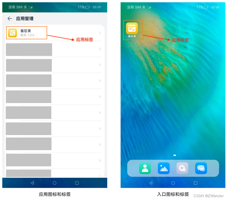 “应用图标”和“标签”是在设置应用中使用,例如设置应用中的应用列表。“入口图标”是应用安装完成后在设备桌面上显示出来的,入口图标是以UIAbility为粒度,支持同一个应用存在多个入口图标和标签,点击后进入对应的UIAbility界面。
