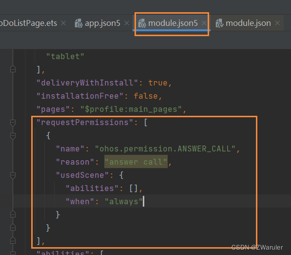 为使应用能够正常使用UIAbility,需要在module.json5配置文件的abilities标签中声明UIAbility的名称、入口、标签等相关信息。
