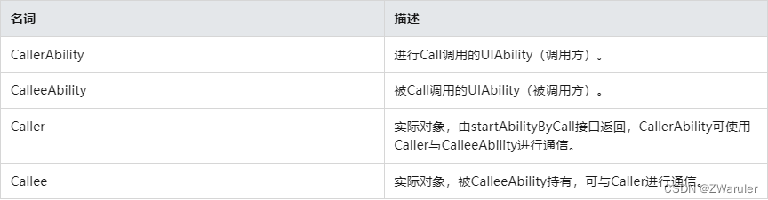 - 调用方可使用startAbilityByCall所返回的Caller对象与被调用方进行通信,而startAbility不具备通信能力。