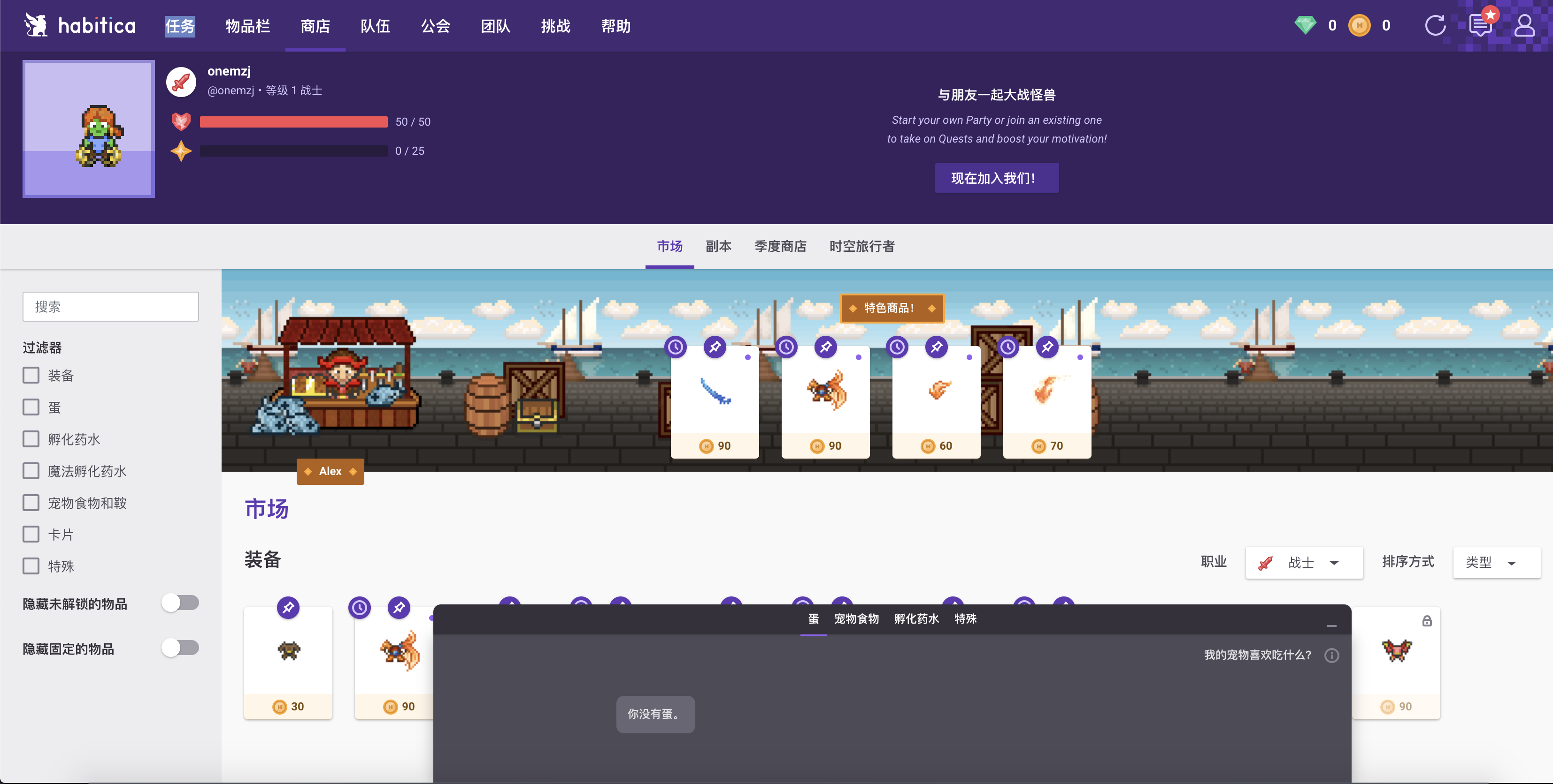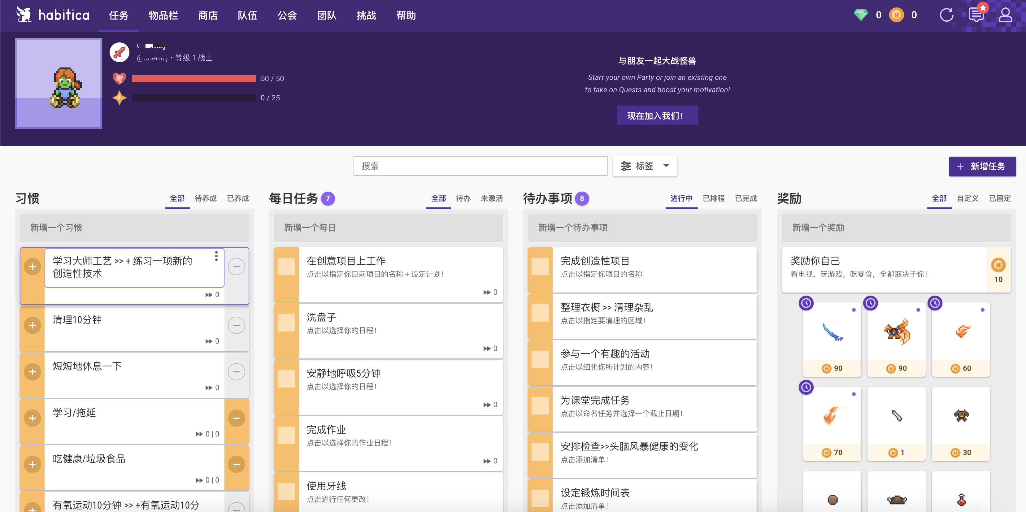 Habitica 是习惯养成及生产力应用,让你 “游戏人生”。游戏里的奖惩措施能激励你完成任务。Habitica 能够帮助你达成目标,变得健康,勤奋,快乐。Habitica 可以让你如角色扮演游戏般对待你的目标,对待你的生活。当你成功时升级,当你失败时掉血,然后一直不断地赚钱买武器和盔甲。Habitica 前端使用 Vue 编写。