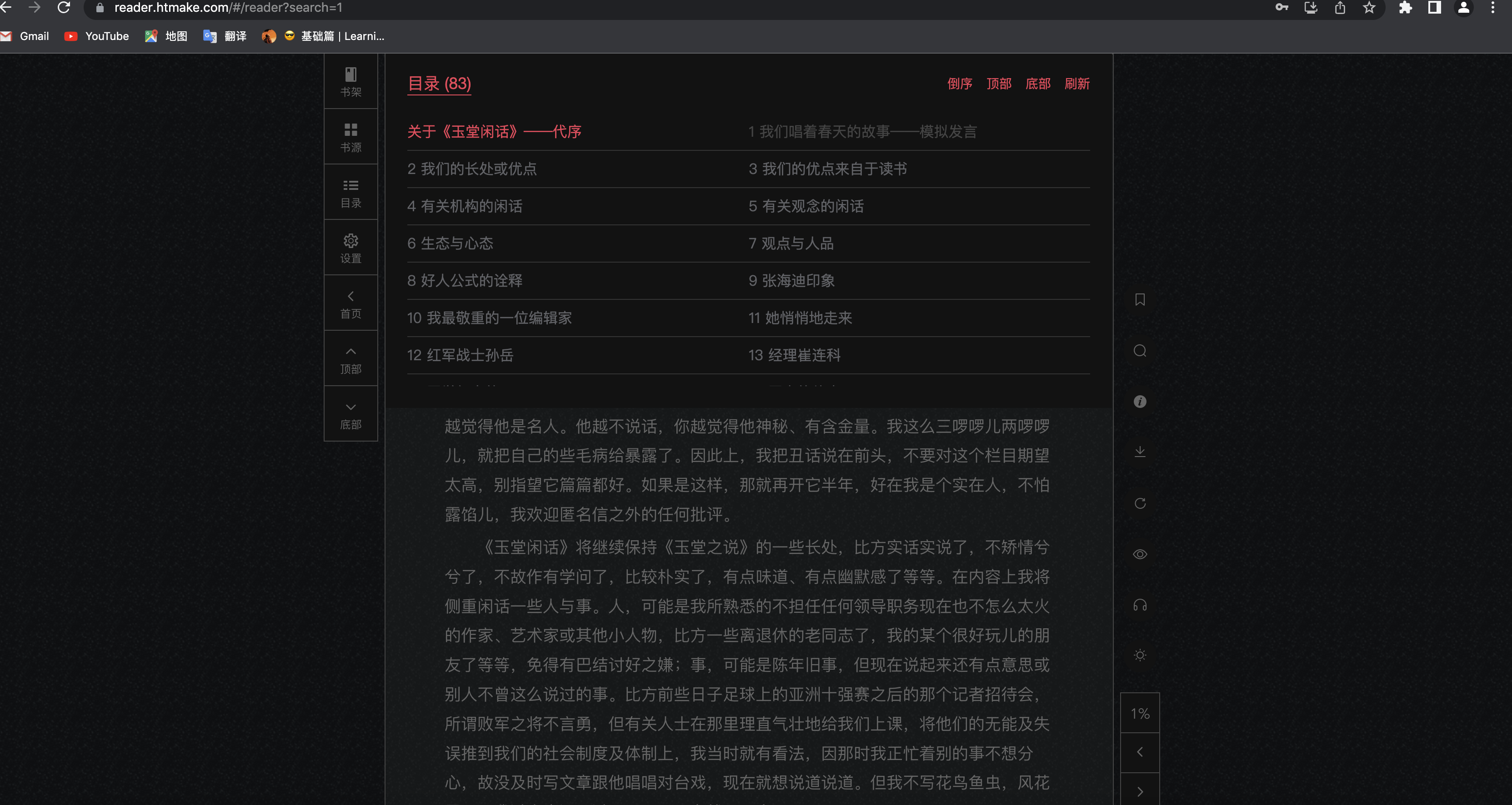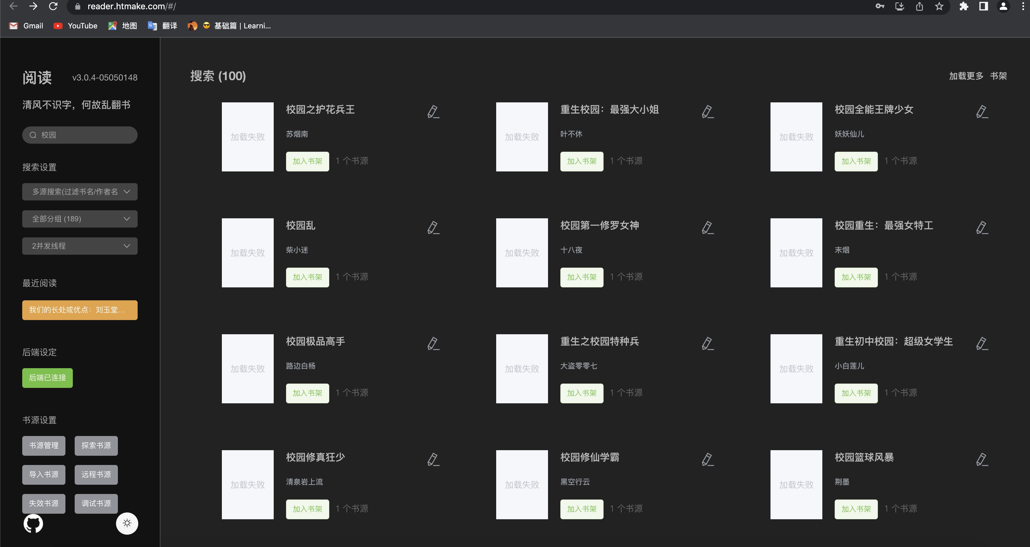 Reader 是一个前端基于 Vue.js + Element 的阅读工具。其支持书架管理、搜索、书海、看书、换源、翻页方式、手势支持、自定义主题、自定义样式、WebDAV同步、文字替换过滤、听书、用户配置备份恢复、漫画、音频、书源失效检测、导入本地TXT、EPUB、UMD格式的书籍、书籍分组、RSS订阅、定时更新书架、并发搜书、本地书仓等功能。