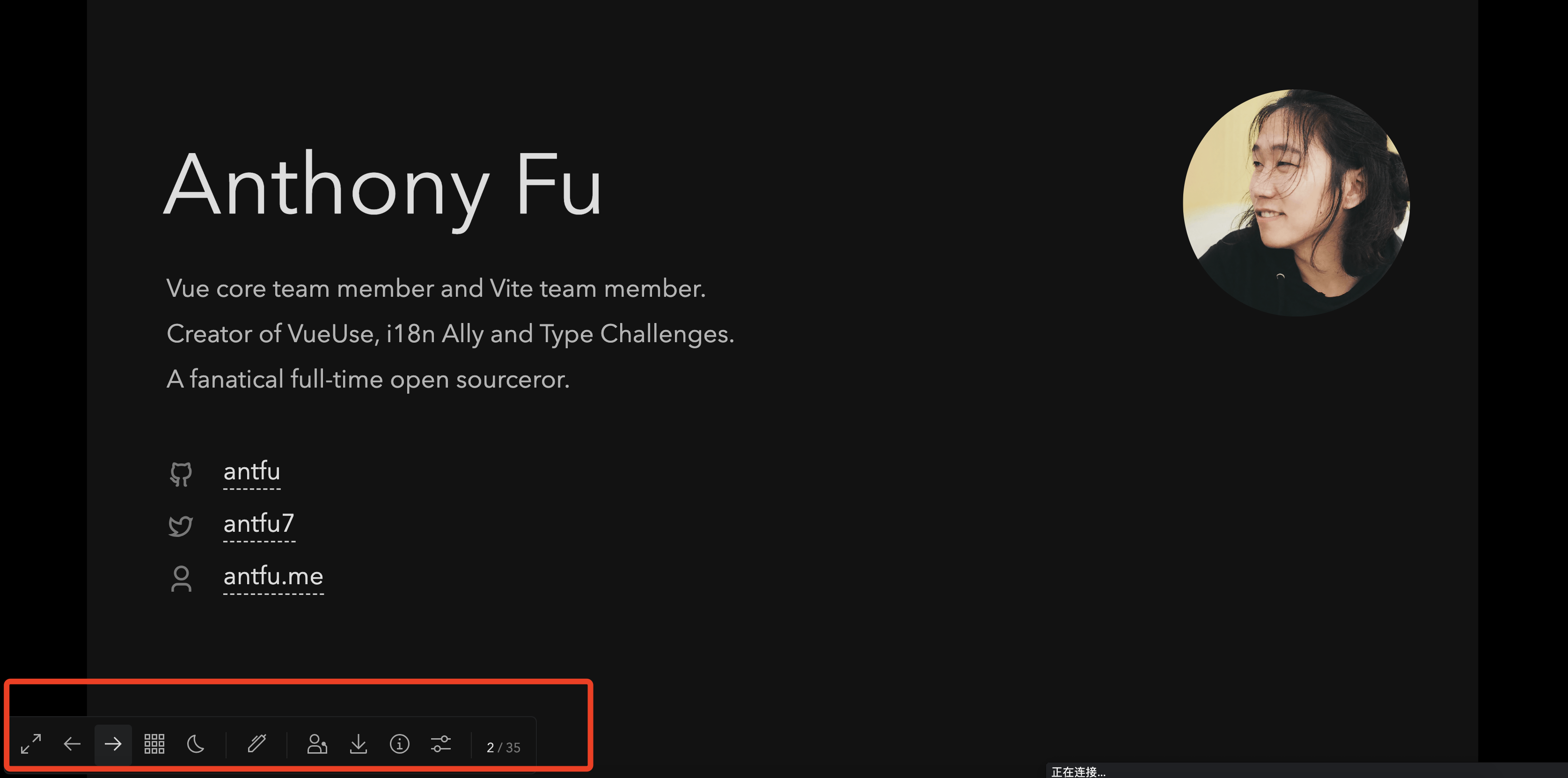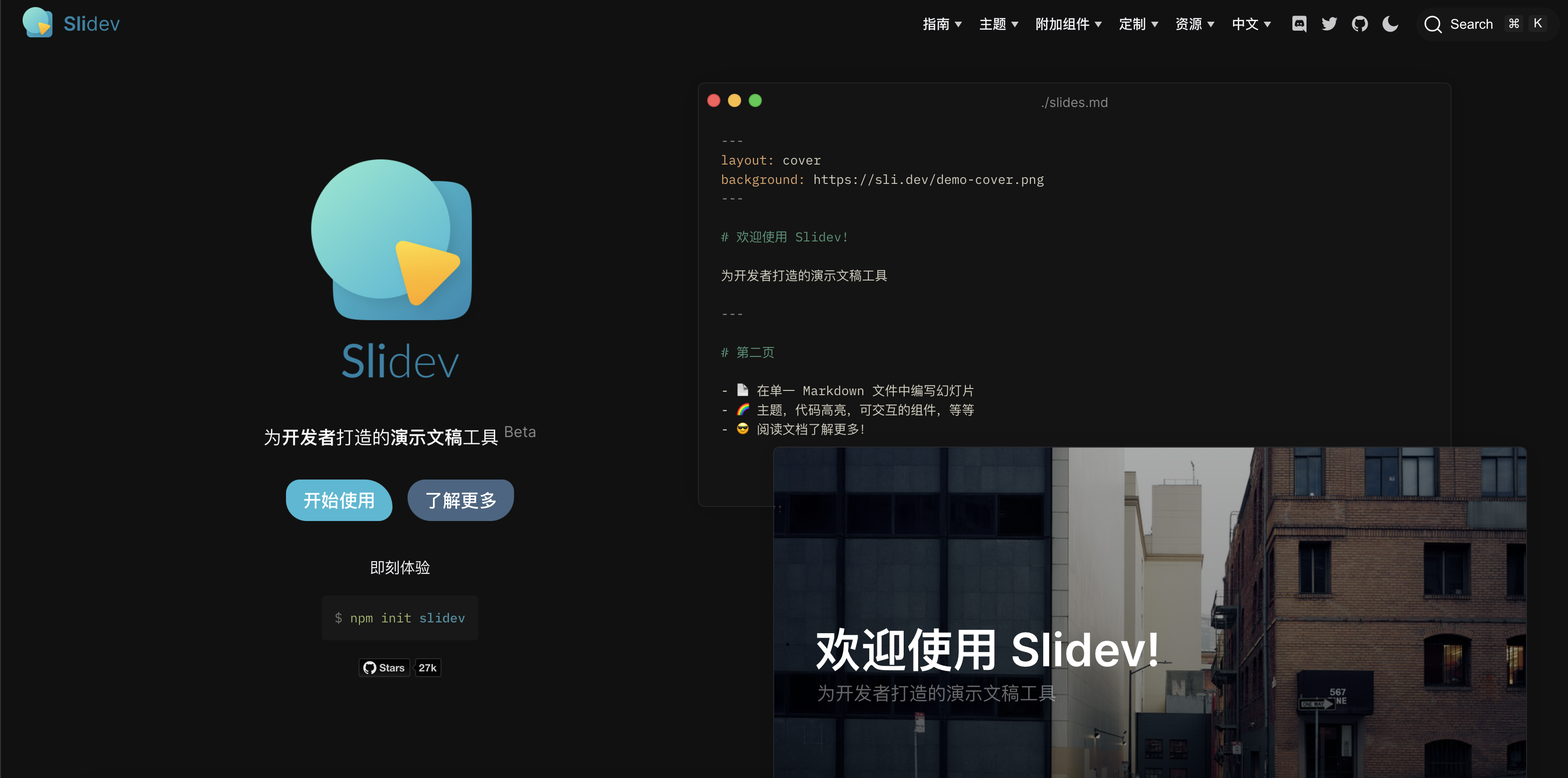 Slidev 是基于 Web 的幻灯片制作和演示工具。它旨在让开发者专注在 Markdown 中编写内容,同时拥有支持 HTML 和 Vue 组件的能力,并且能够呈现像素级完美的布局,还在你的演讲稿中内置了互动的演示样例。它使用了功能丰富的Markdown文件来生成精美的幻灯片,具有即时重载的体验。它还拥有很多内置的集成功能,如实时编码、导出 PDF、演讲录制等。Slidev 基于 Vue 3 + Vite + VueUse 等技术实现。