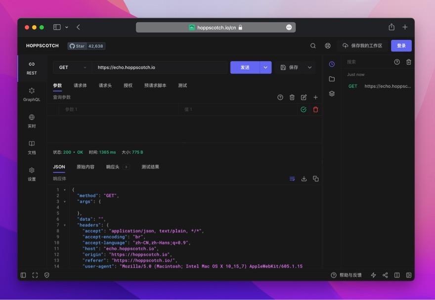 Hoppscotch 是一种可以通过 Web 服务的方式构建 API 访问的工具,使用 Node.js + Vue 开发,采用简约的 UI 设计,能实时发送和获取响应值,它的的前身是 Postwoman。Hoppscotch 功能与 Postman 类似,不仅支持 HTTP/HTTPS ,而且还支持 WebSocket、Socket.io、EventSourcee、MQTT、GraphQL。