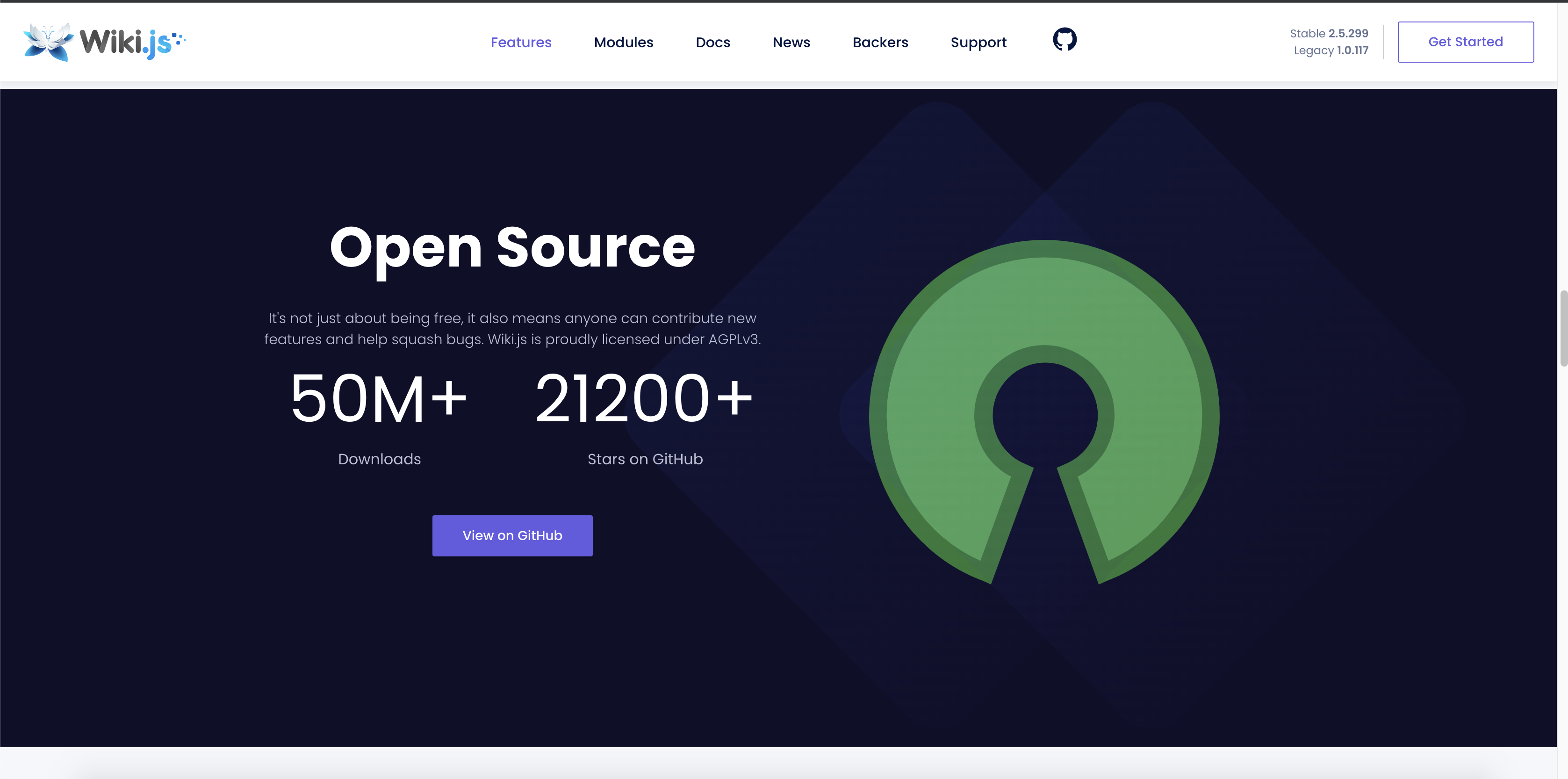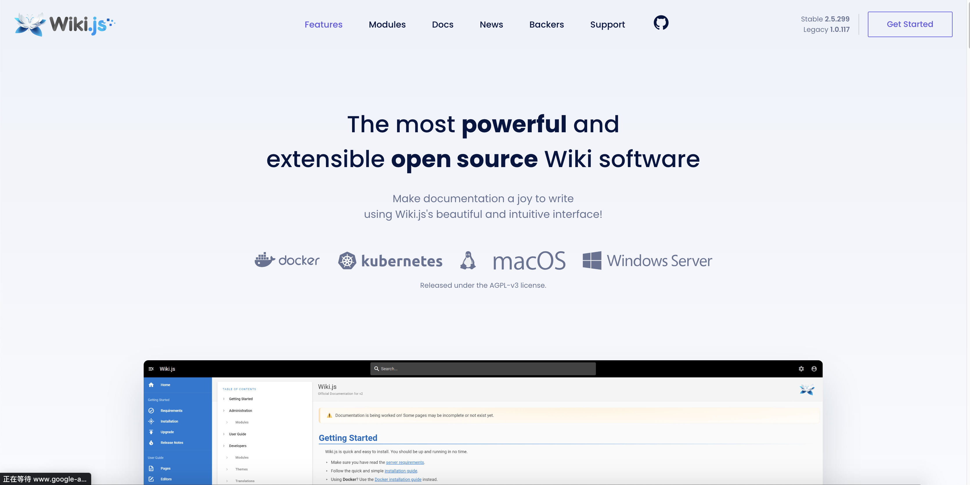 Wiki.js 是一款基于 Node.js + Vue 技术栈的强大、可高度扩展、开源的 Wiki 系统。其界面简洁美观、权限管理灵活,支持多种编辑器、多种用户验证方式、多种备份存储方式、多种搜索引擎,支持国际化、自定义主题、流量分析等,适合做小团队的知识库,适合管理和阅读,支持协同创作。