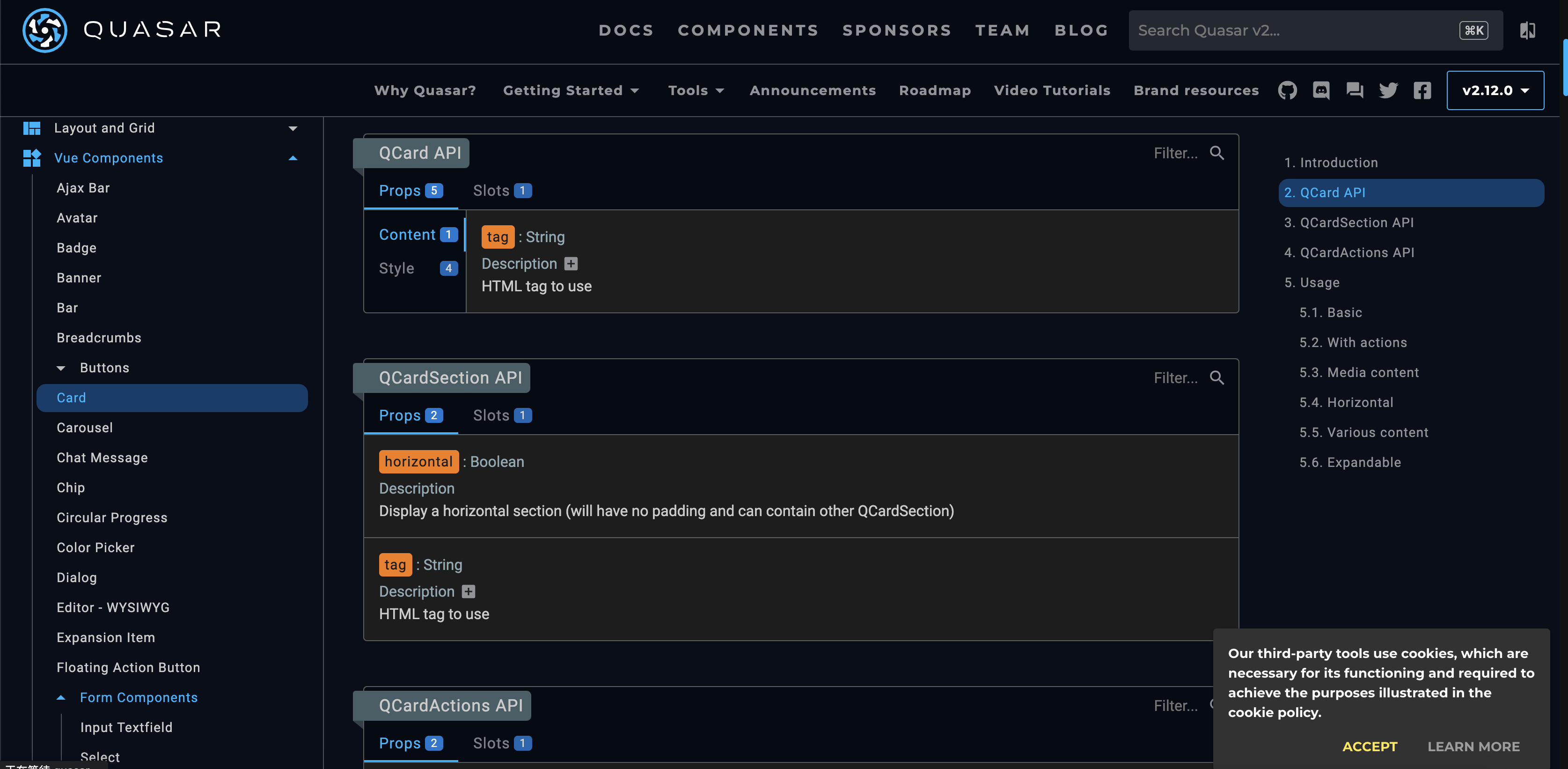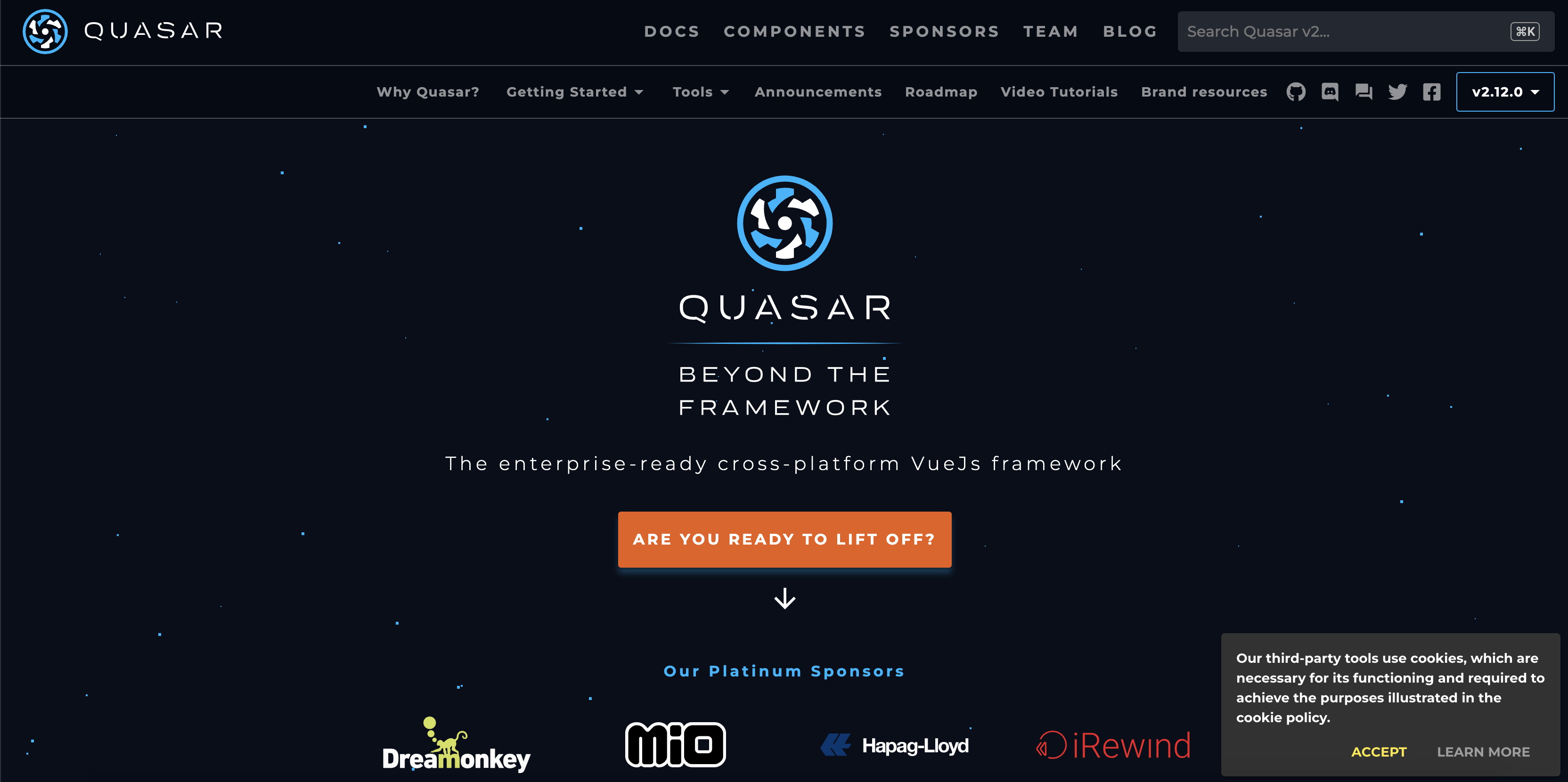 这里有一个很棒的文档和一组庞大的组件,设计时考虑到了性能和响应能力。Quasar默认集成了最佳实践(HTML/CSS/JS缩小、缓存破坏、树抖动、源映射、带延迟加载的代码拆分、ES6泄漏、代码linting、可访问性),因此您可以主要关注应用程序的功能。它还提供了一个CLI工具,可以轻松地构建新项目。