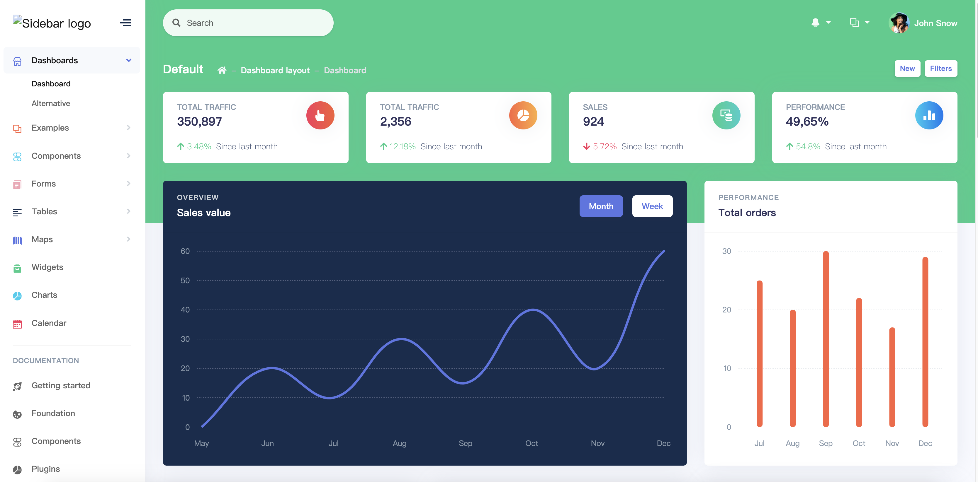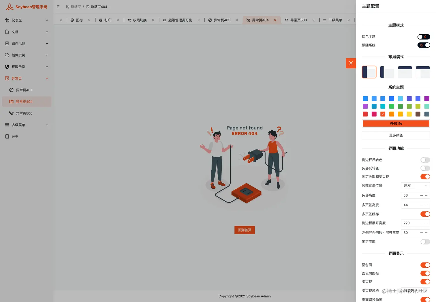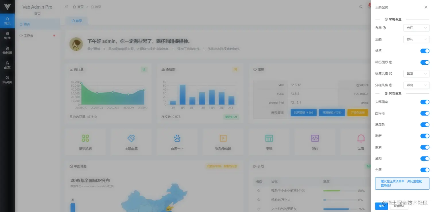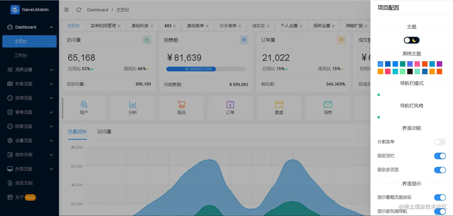 - 极方便扩展的主题配置功能,默认支持三种典型的中后台风格