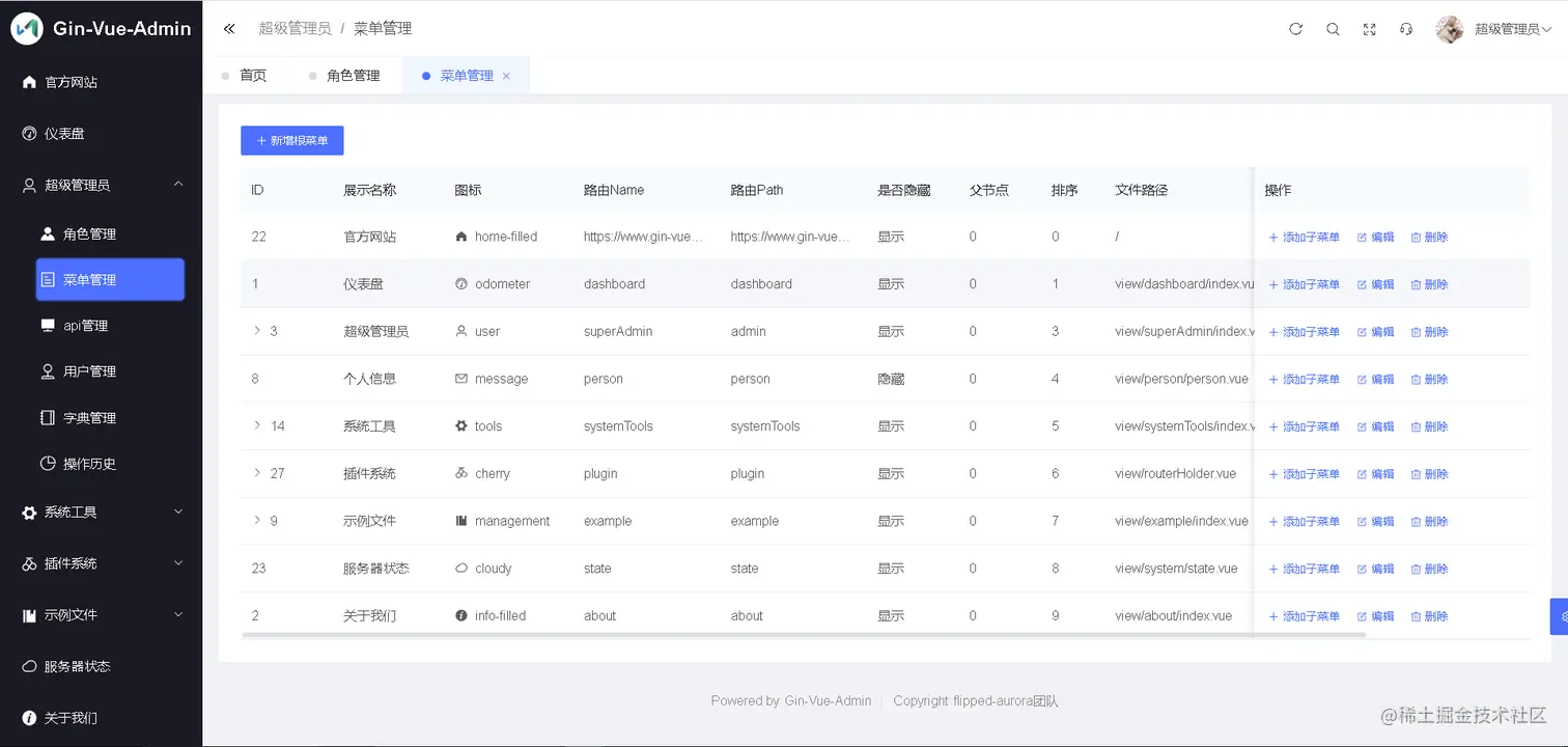 - 角色管理:创建权限控制的主要对象,可以给角色分配不同api权限和菜单权限。