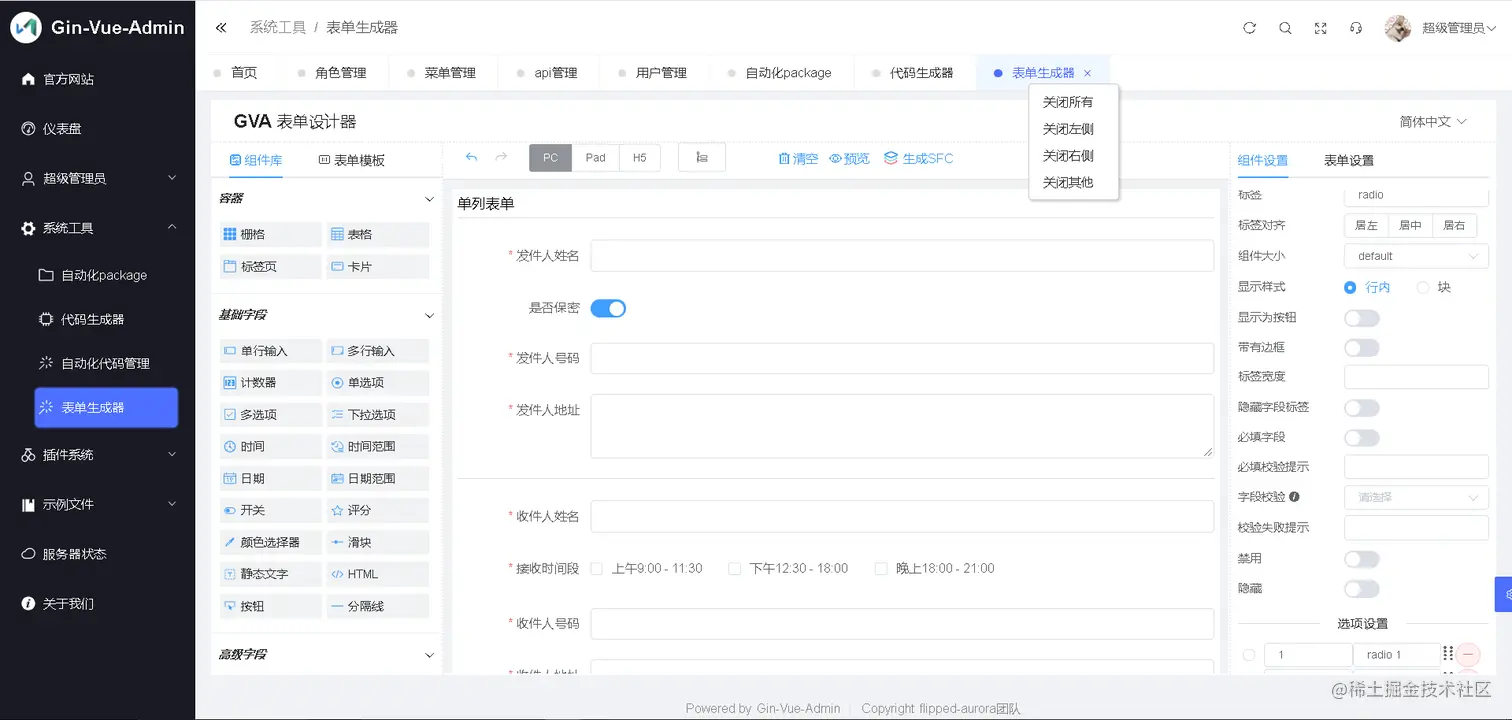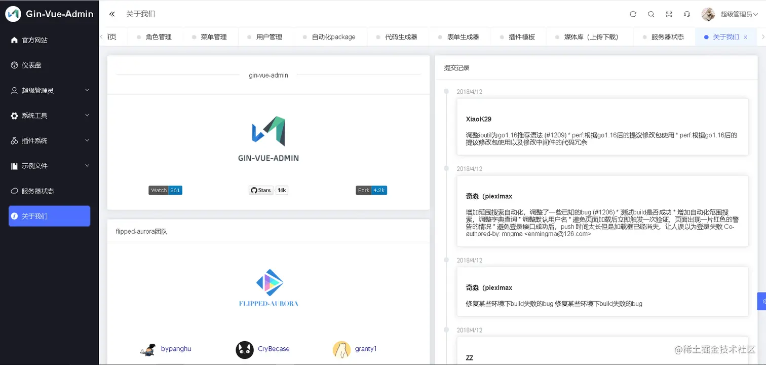 gin-vue-admin(github上的标星数为14.2k)基于 vite + vue3 + gin 搭建的开发基础平台(支持TS,JS 混用),集成 jwt鉴权,权限管理,动态路由,显隐可控组件,分页封装,多点登录拦截,资源权限,上传下载,代码生成器,表单生成器等开发必备功能。