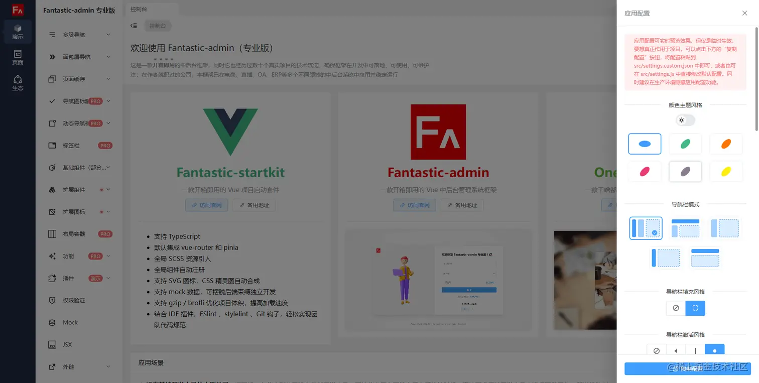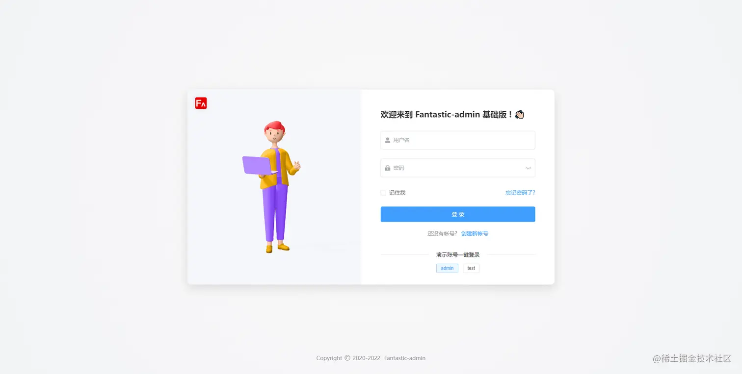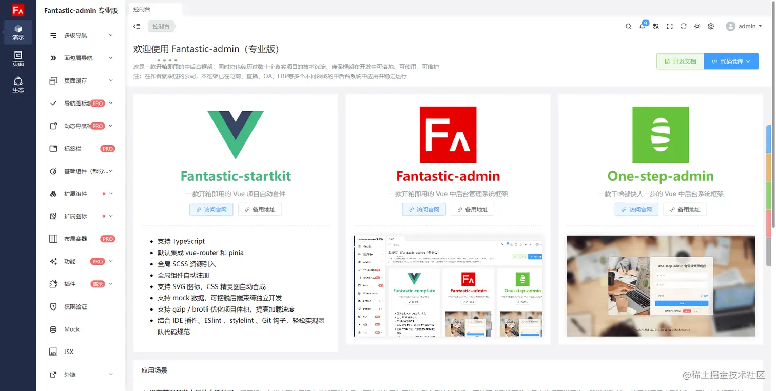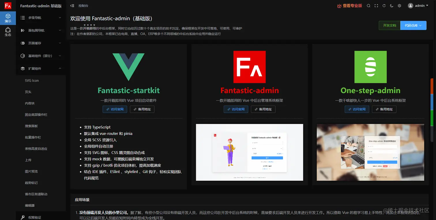 Fantastic-admin是一款开箱即用的 Vue 中后台管理系统框架。有 vue2(现已停止维护)和 vue3 的版本。