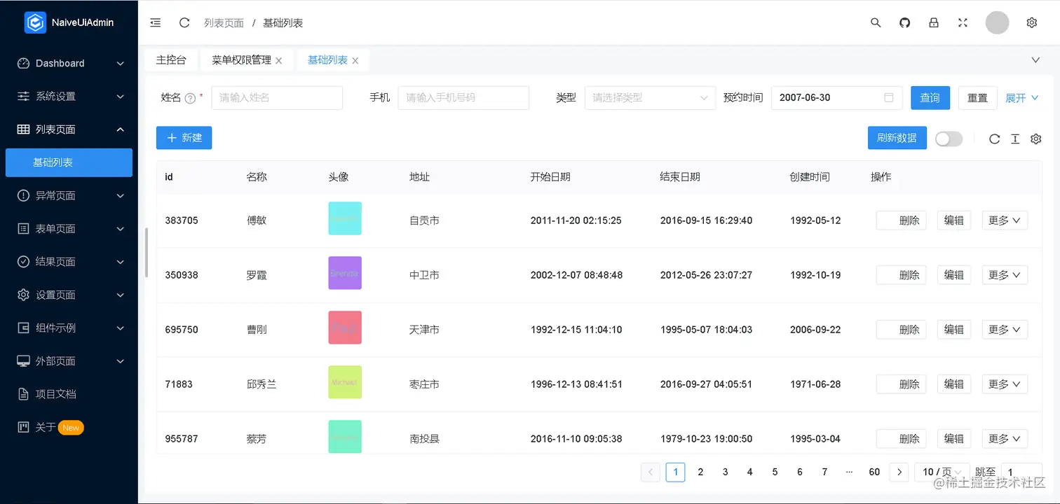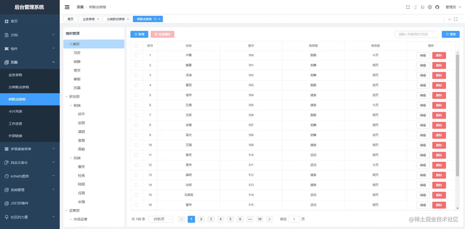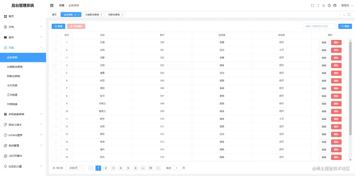 - 典型增删改查的三种业务表格,详情请查看“页面栏目”内的“业务表格”、“分类联动表格”、“树联动表格”