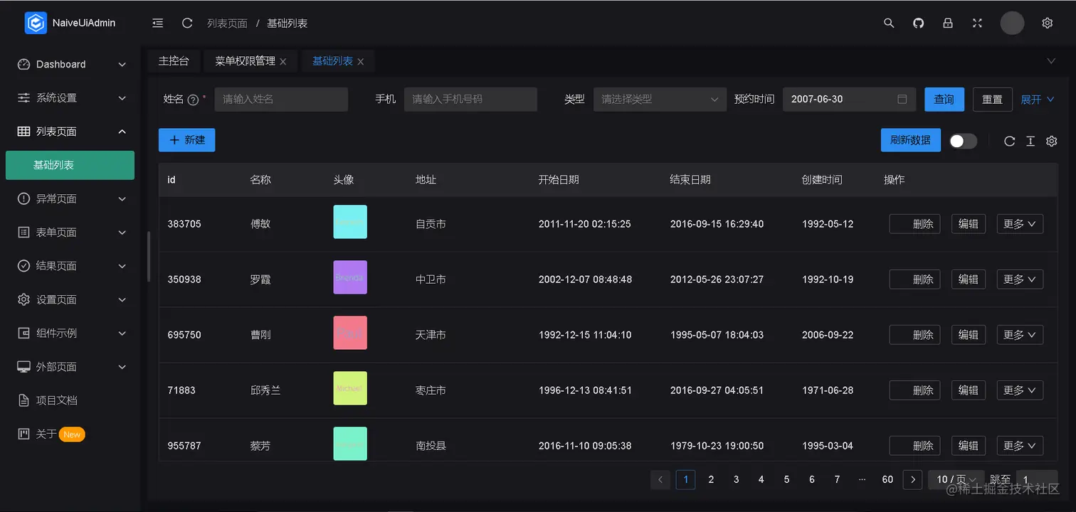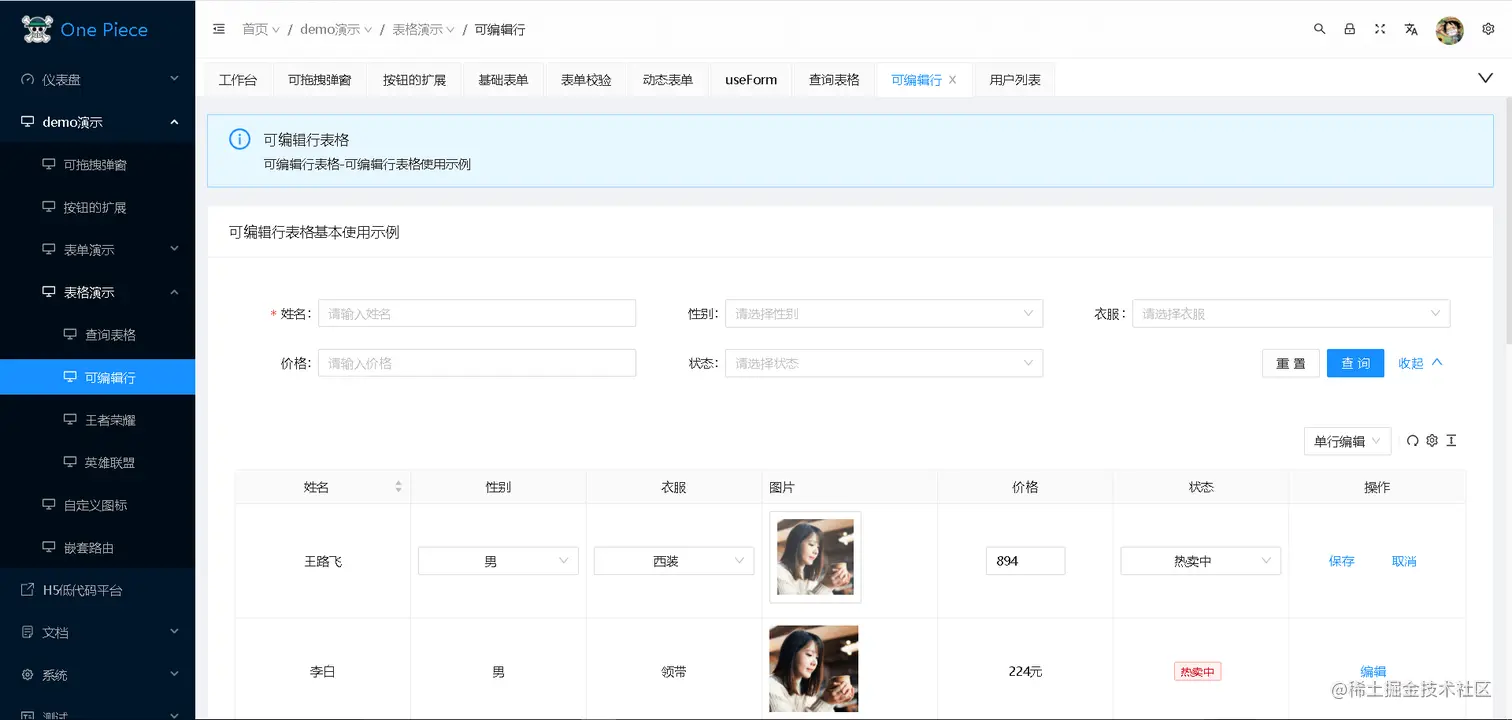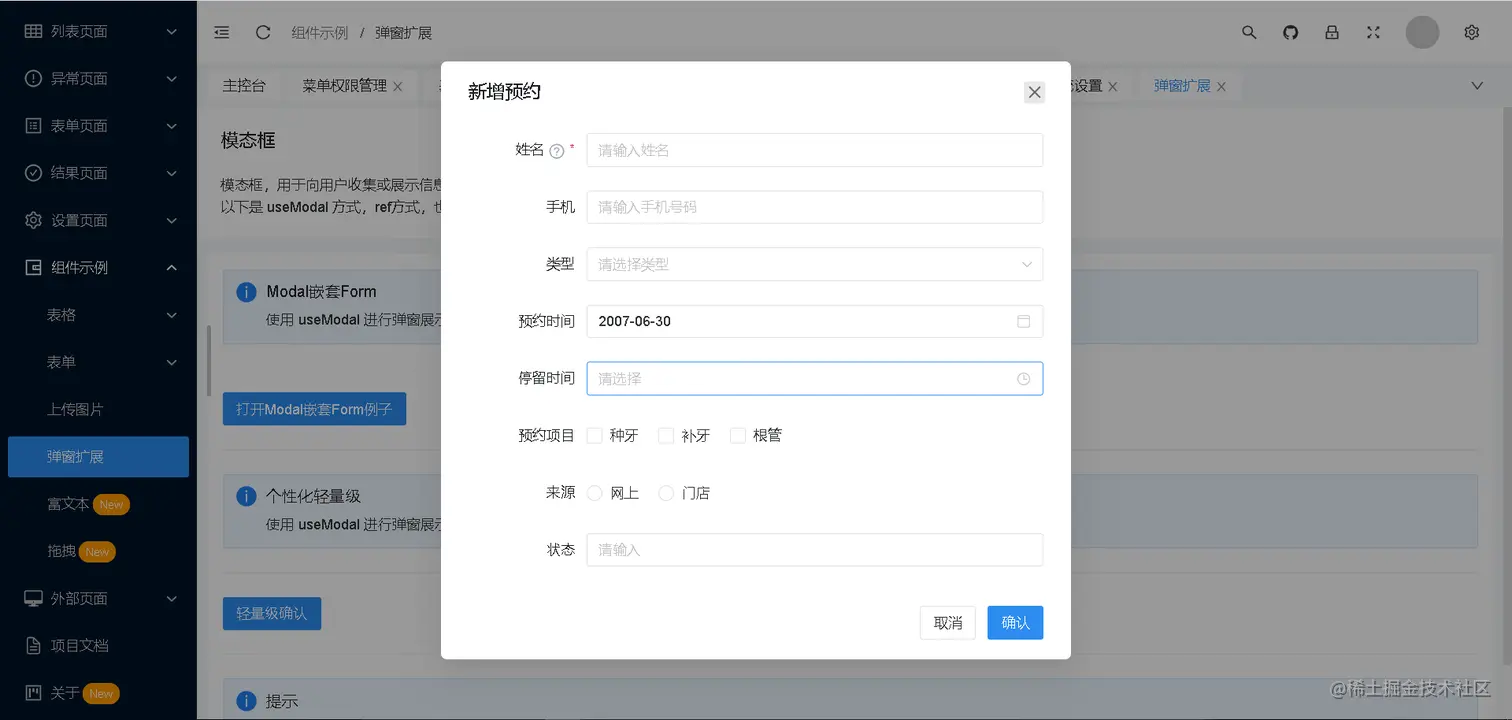 - 典型增删改查的三种业务表格,详情请查看“页面栏目”内的“业务表格”、“分类联动表格”、“树联动表格”