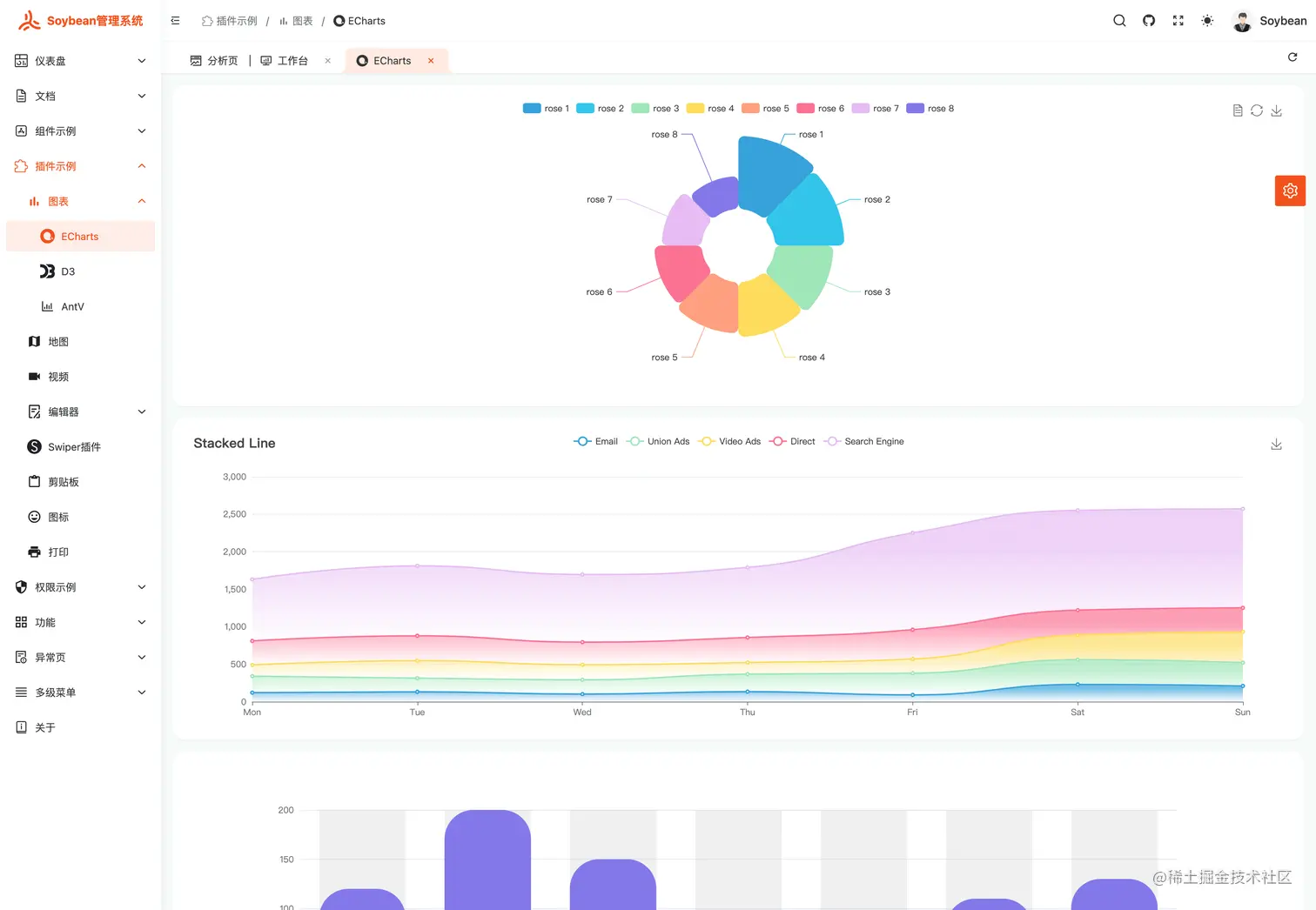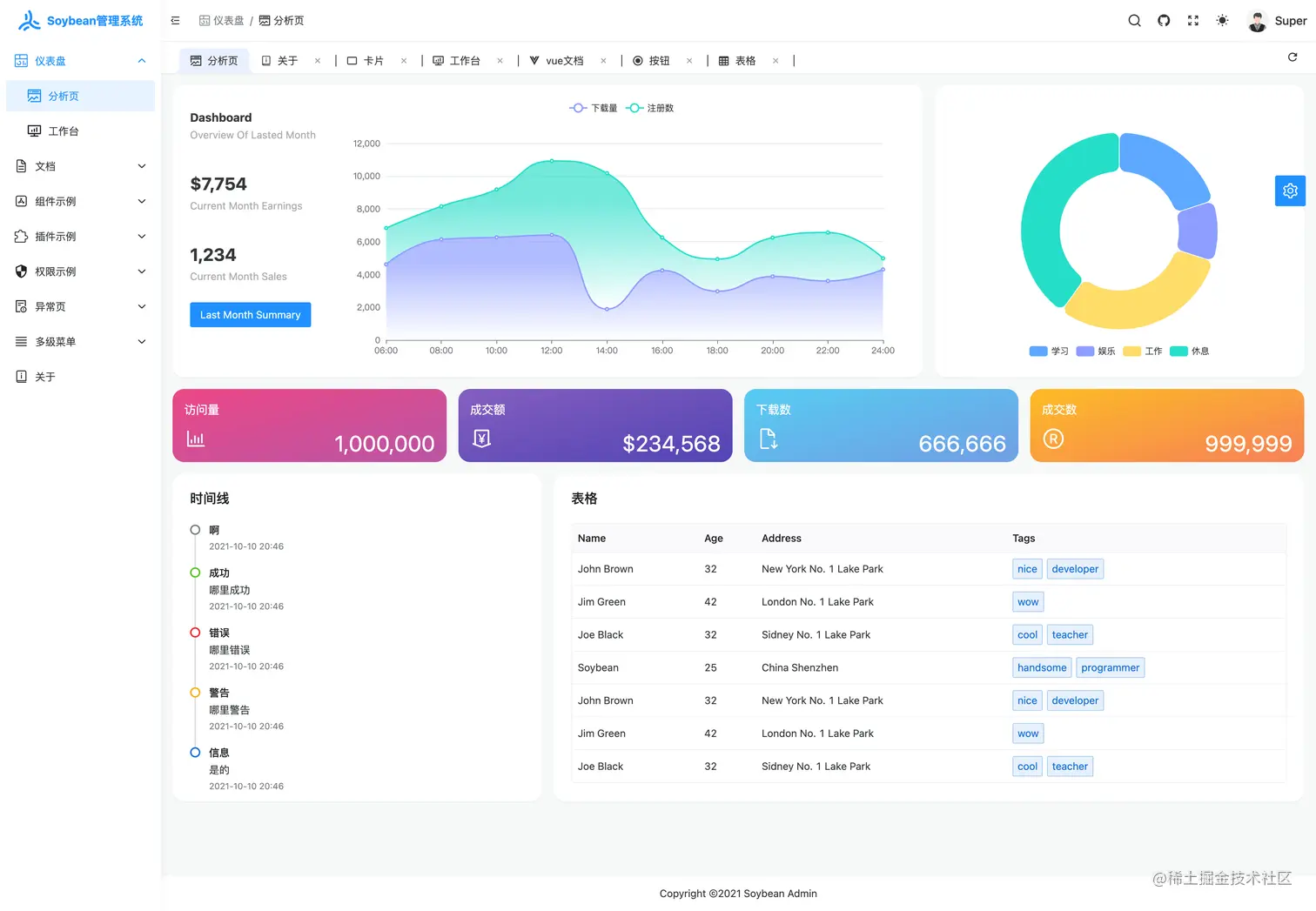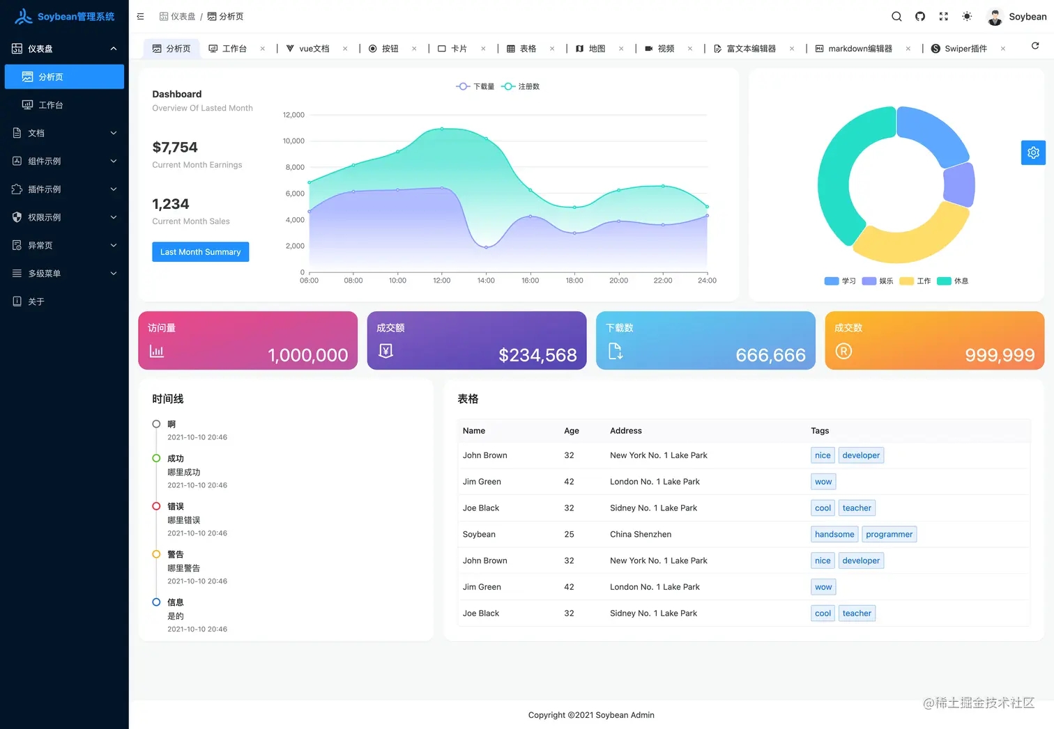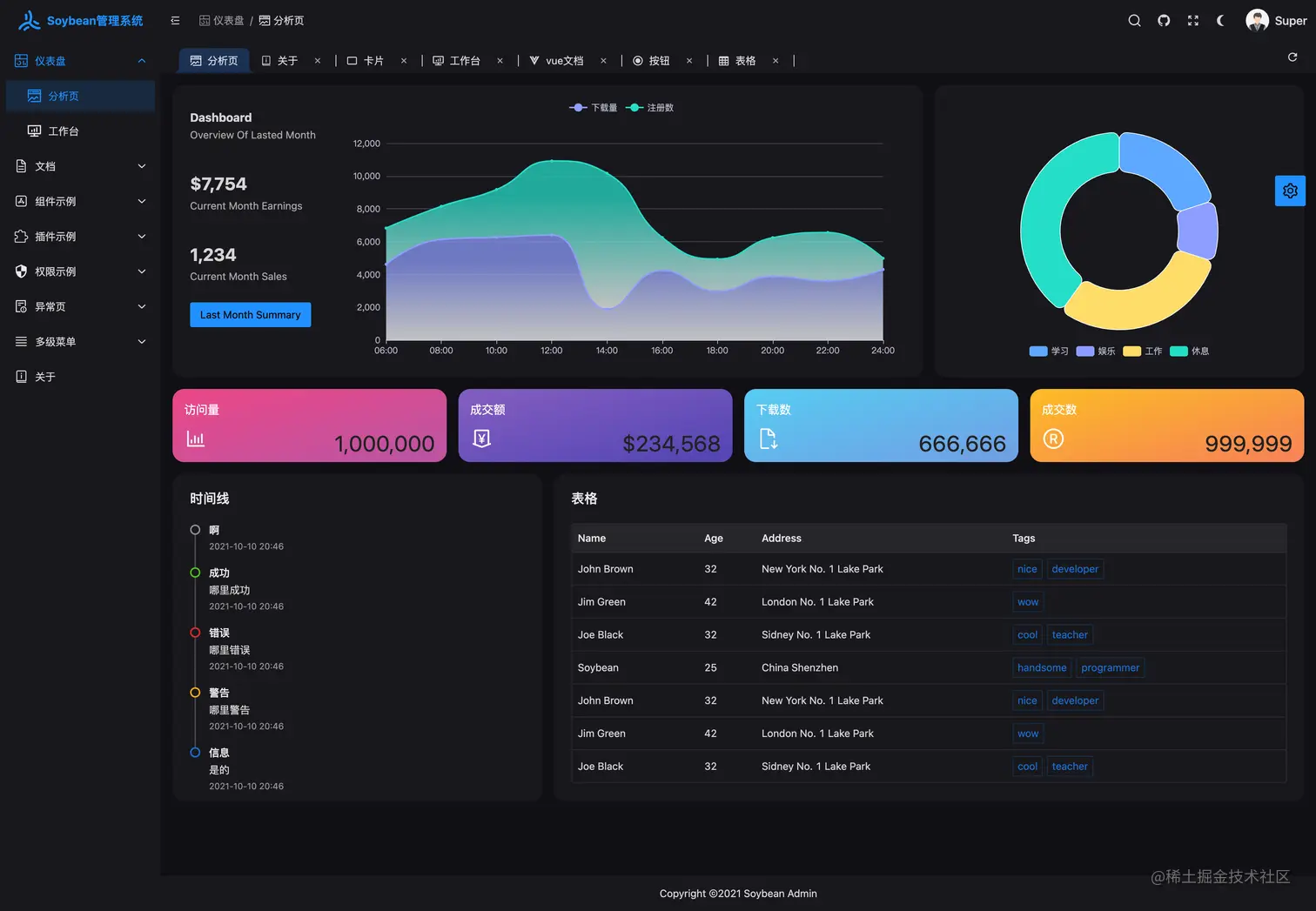Soybean Admin(github上的标星数为1.3k)是一个基于 Vue 3、Vite3、TypeScript、NaiveUI、Pinia 和 UnoCSS 的清新优雅的中后台模版,它使用了最新的前端技术栈,内置丰富的主题配置,有着极高的代码规范,基于 mock 实现的动态权限路由,开箱即用的中后台前端解决方案,也可用于学习参考。
